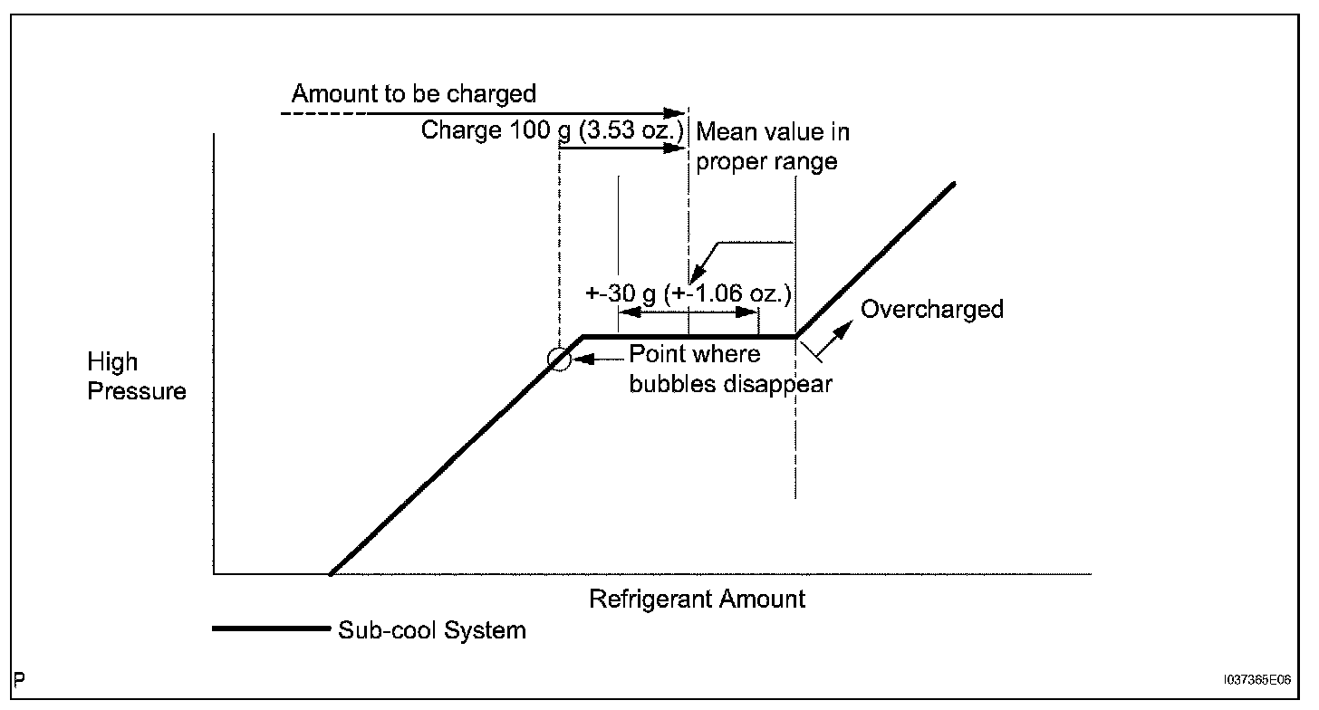 - Approximately 100 g (3.53 oz.) of refrigerant may need to be charged after bubbles disappear. The refrigerant amount should be checked by measuring its quantity, and not with the sight glass.