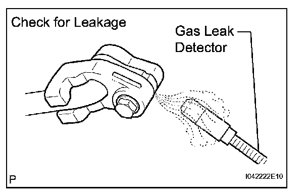 c. Using a gas leak detector, check the refrigerant line for leakage.