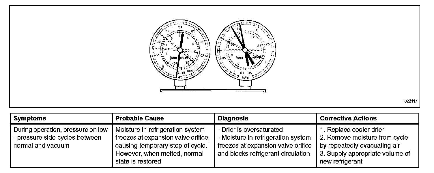 2. The A/C system periodically changes between normal and improper function due to moisture in the refrigeration system.