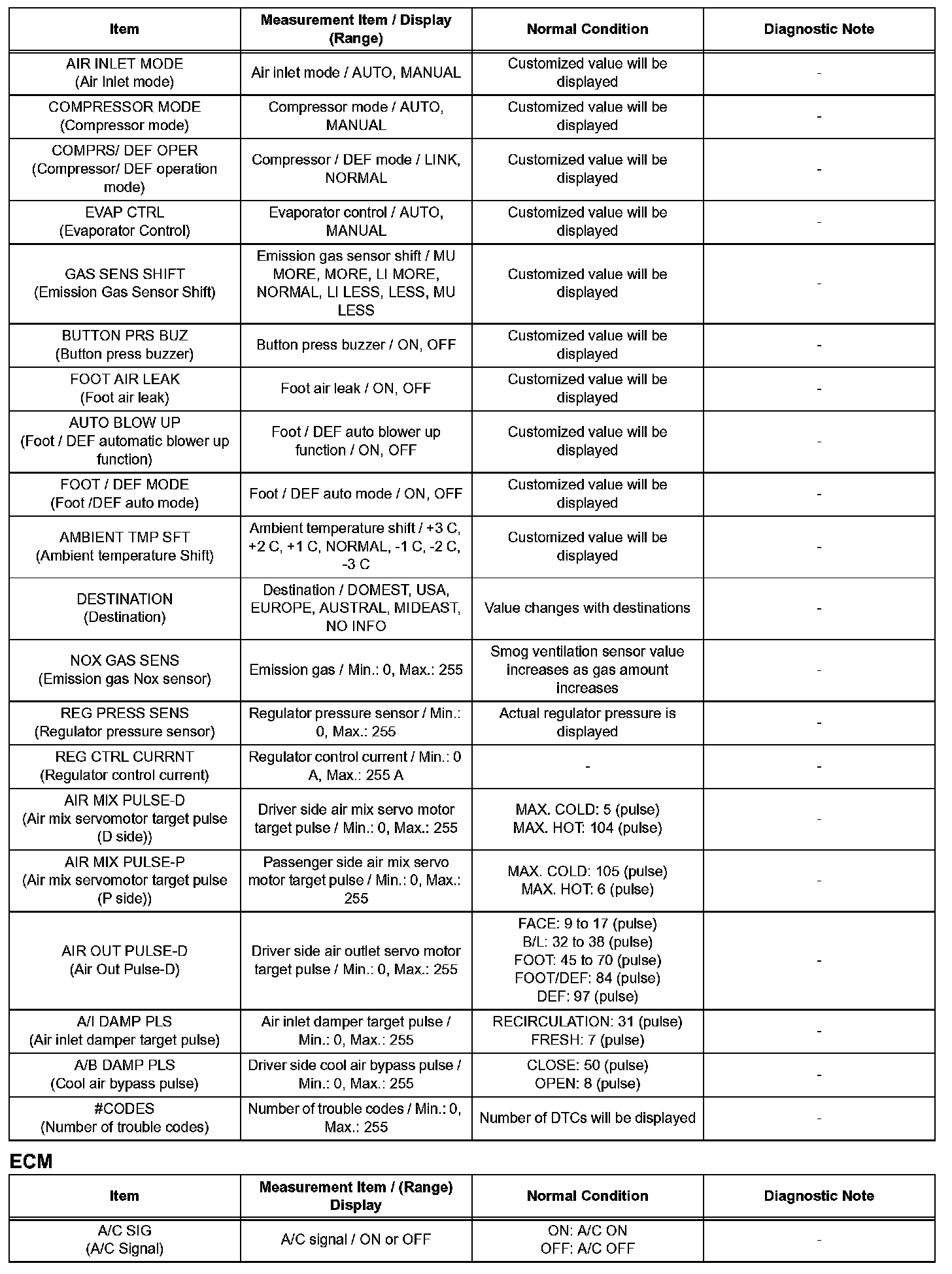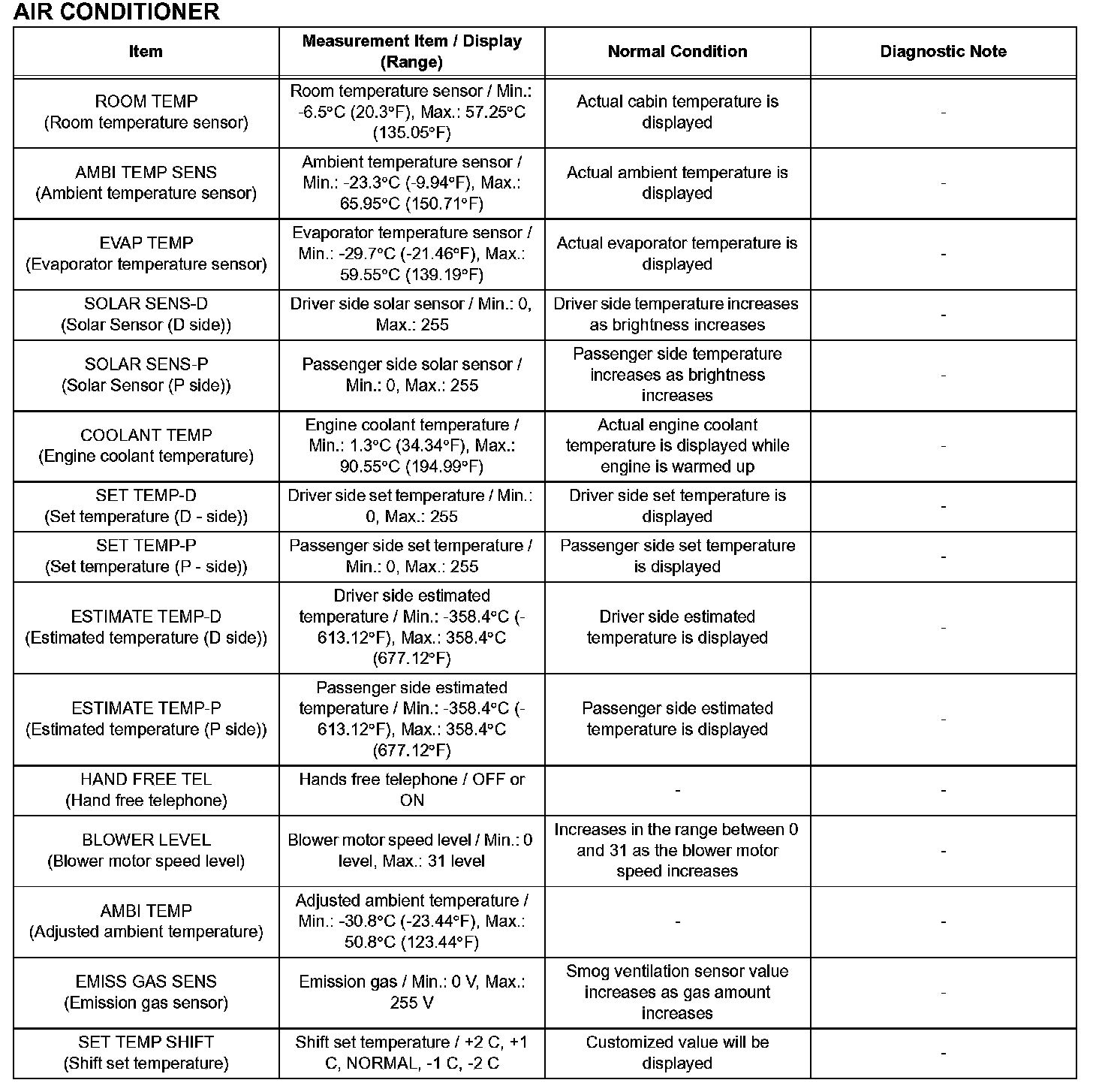 d. Enter the menus: DIAGNOSIS / OBD/ MOBD / AIR CONDITIONER / DATA LIST.