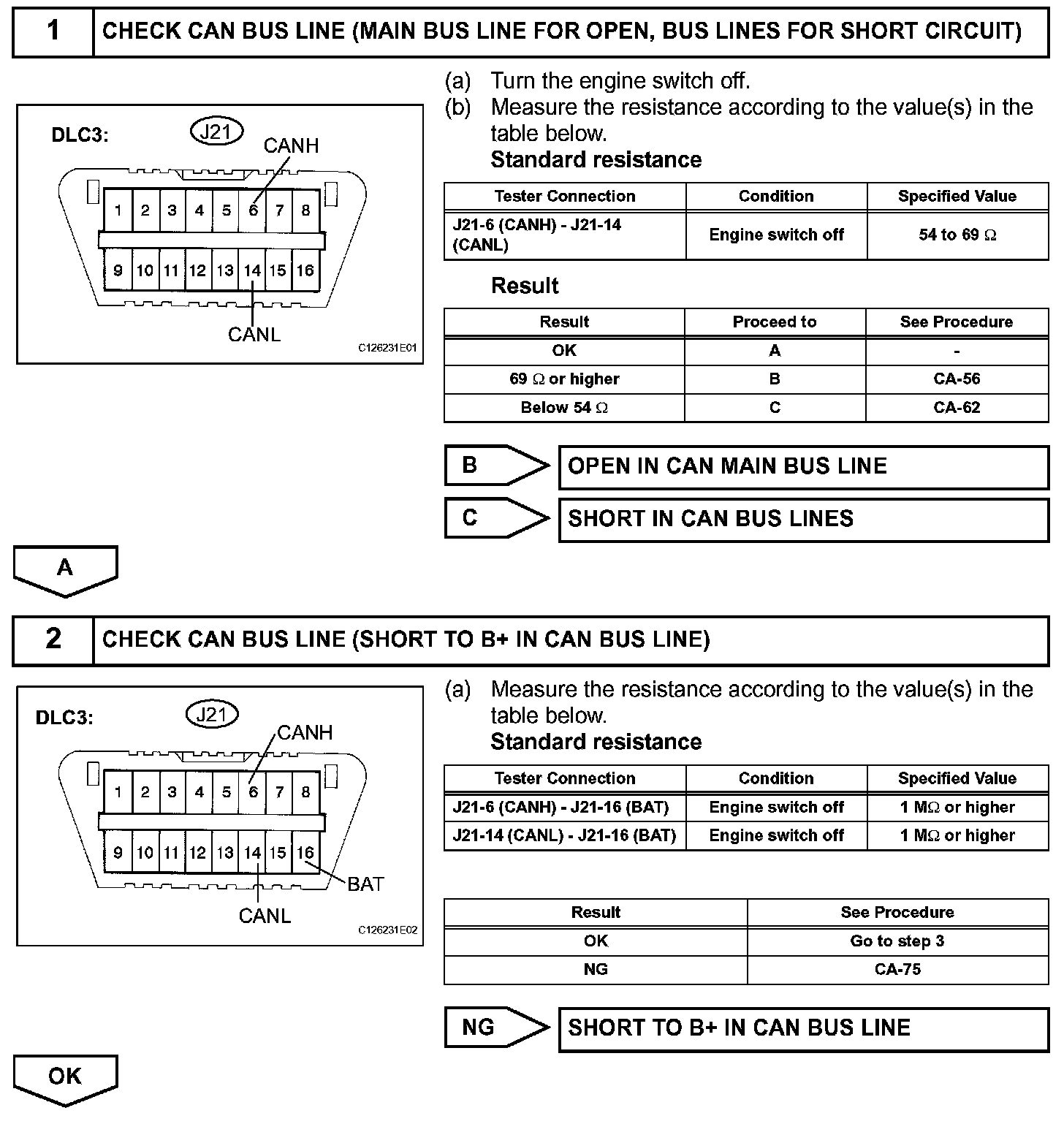 When any DTC for the CAN communication system is output, first measure the resistance between the terminals of the DLC3 to specify the trouble area.Then check that there is no short in the CAN main bus line, between the CAN bus lines, to +B, or to GND.