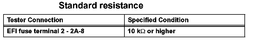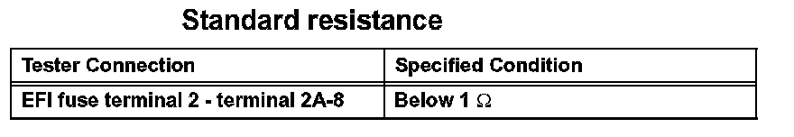 1. Remove the EFI fuse. Using an ohmmeter, measure the resistance between the terminals.