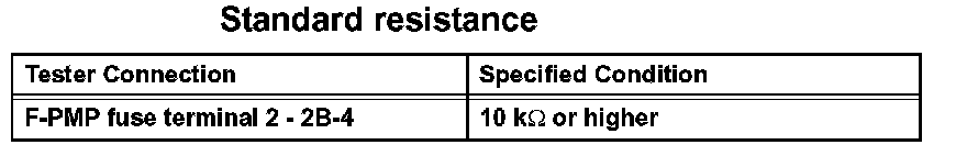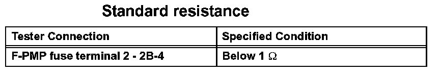 1. Remove the F/PMP fuse. Using an ohmmeter, measure the resistance between the terminals.