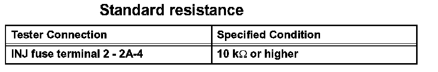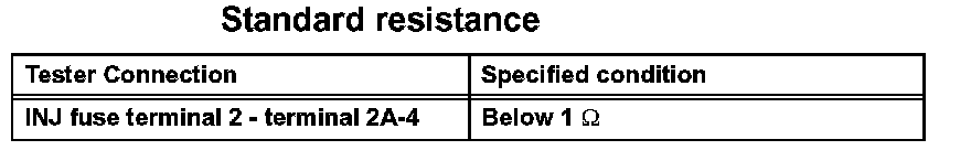1. Remove the INJ fuse. Using an ohmmeter, measure the resistance between the terminals.