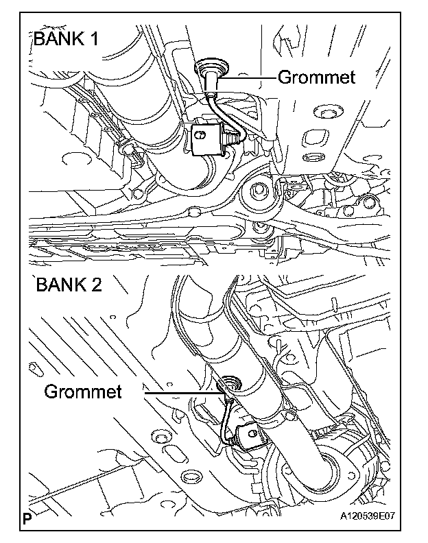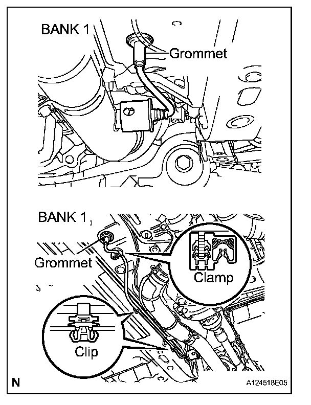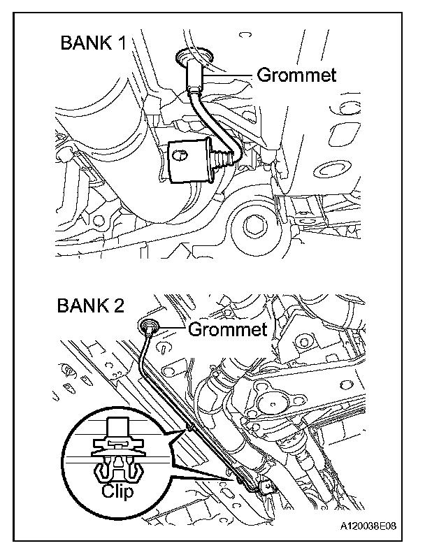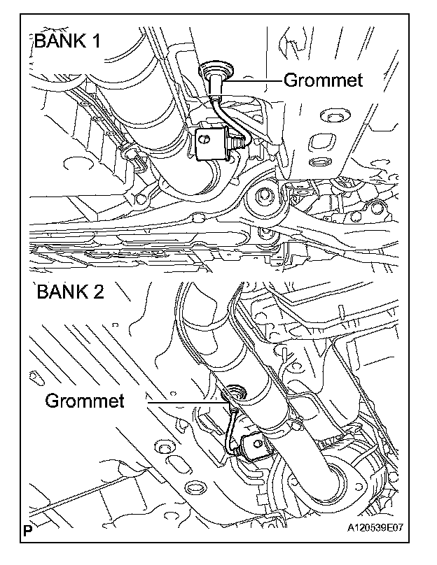 b. Pass the heated oxygen sensor connector through the floor panel and install the grommet.