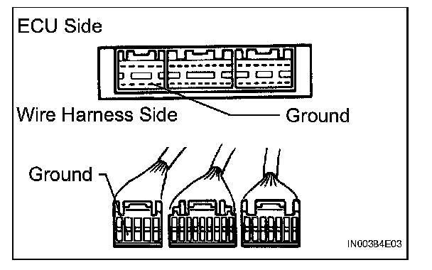 2. Disconnect the ECU connector. Check the ground terminal on the ECU side and wire harness side for bending, corrosion or foreign matter. Lastly, check the contact pressure of the female terminals.