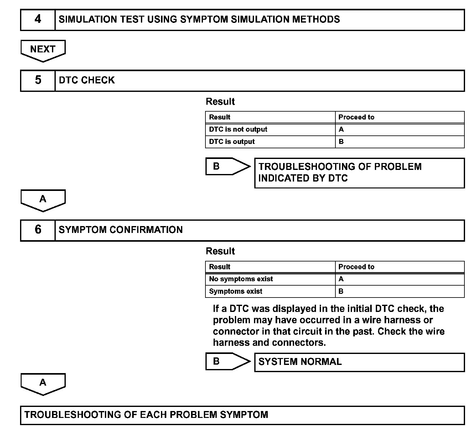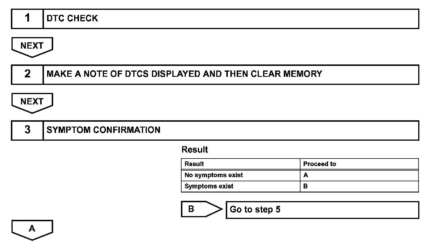 - In the DTC check, it is very important to determine whether the problem indicated by the DTC either: 1) still occurs, or 2) occurred in the past but has returned to normal. In addition, the DTC should be compared to the problem symptom to see if they are related. For this reason, DTCs should be checked before and after confirmation of symptoms (i.e., whether or not problem symptoms exist) to determine current system conditions, as shown in the flowchart.