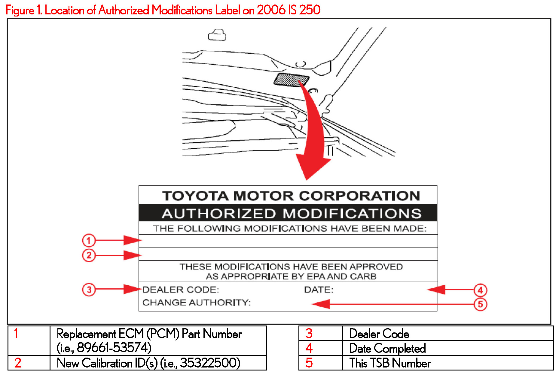 1. Check for the Authorized Modifications Label affixed to the vehicle in the location shown in Figure 1. Confirm if the ECM (PCM) calibration has been updated. If the calibration ID listed is NOT the latest ECM (PCM) calibration - go to step 2.