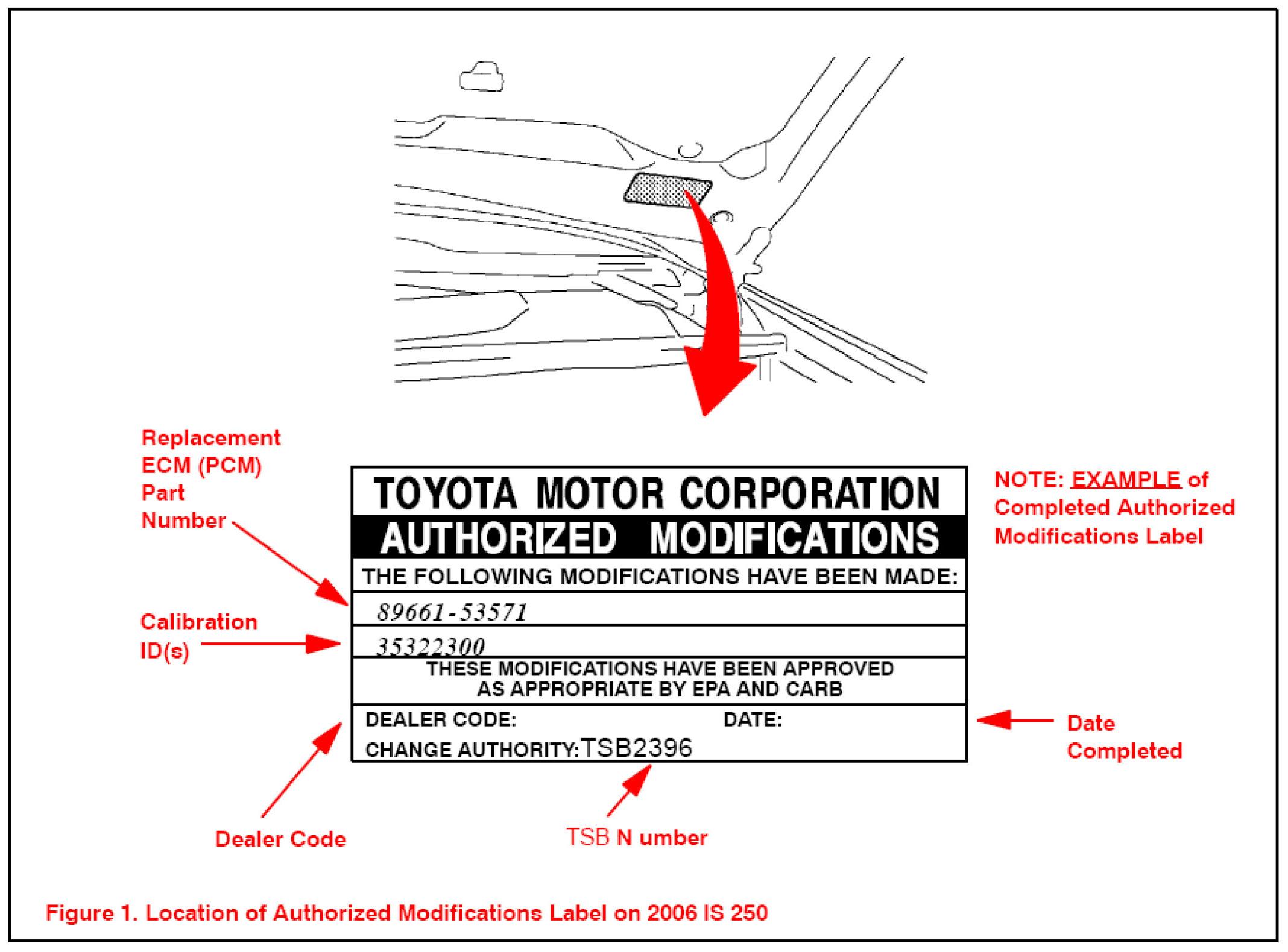 Before proceeding, verify the ECM (PCM) calibration has NOT been updated by checking for the Authorized Modifications Label (shown in step 1 of the Repair Procedure).