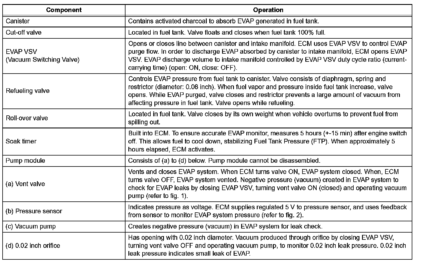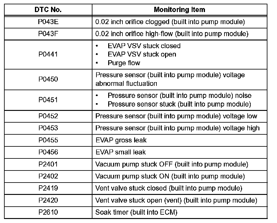 This monitor checks for Evaporative Emission (EVAP) system leaks and pump module malfunctions. The monitor starts 5 hours* after the engine switch is turned off. More than 5 hours are required to allow the fuel to cool down to stabilize the Fuel Tank Pressure (FTP), thus making the EVAP system monitor more accurate. The electric vacuum pump creates negative pressure (vacuum) in the EVAP system and the pressure is measured. Finally, the ECM monitors for leaks from the EVAP system and malfunctions in both the pump module and EVAP VSV, based on the EVAP pressure.