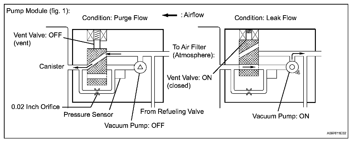 The purge flow volume is also determined by the intake manifold pressure. Atmospheric pressure is allowed into the canister through the vent valve to ensure that the purge flow is maintained when the negative pressure (vacuum) is applied to the canister.