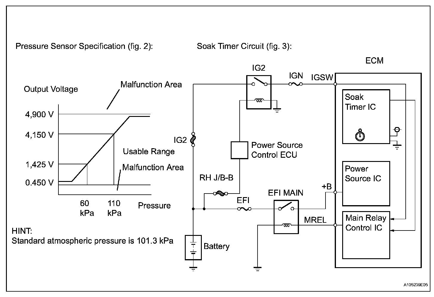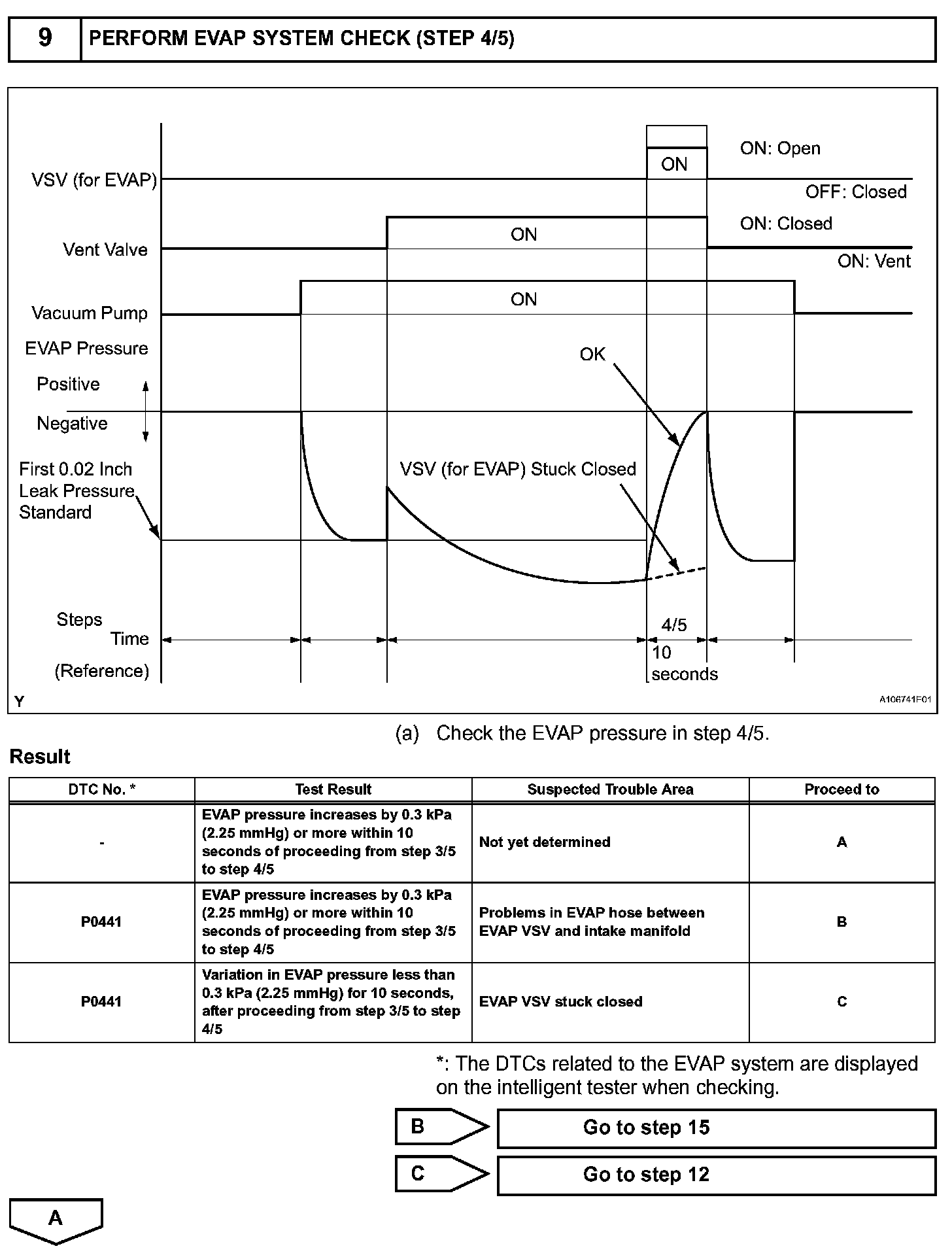 The vent valve turned OFF (open) and the EVAP pressure is then measured. If the variation in the pressure is less than 0.5 kPa (3.75 mmHg), the ECM interprets this as the EVAP VSV being stuck closed, and illuminates the MIL and sets DTC P0441 (2 trip detection logic).