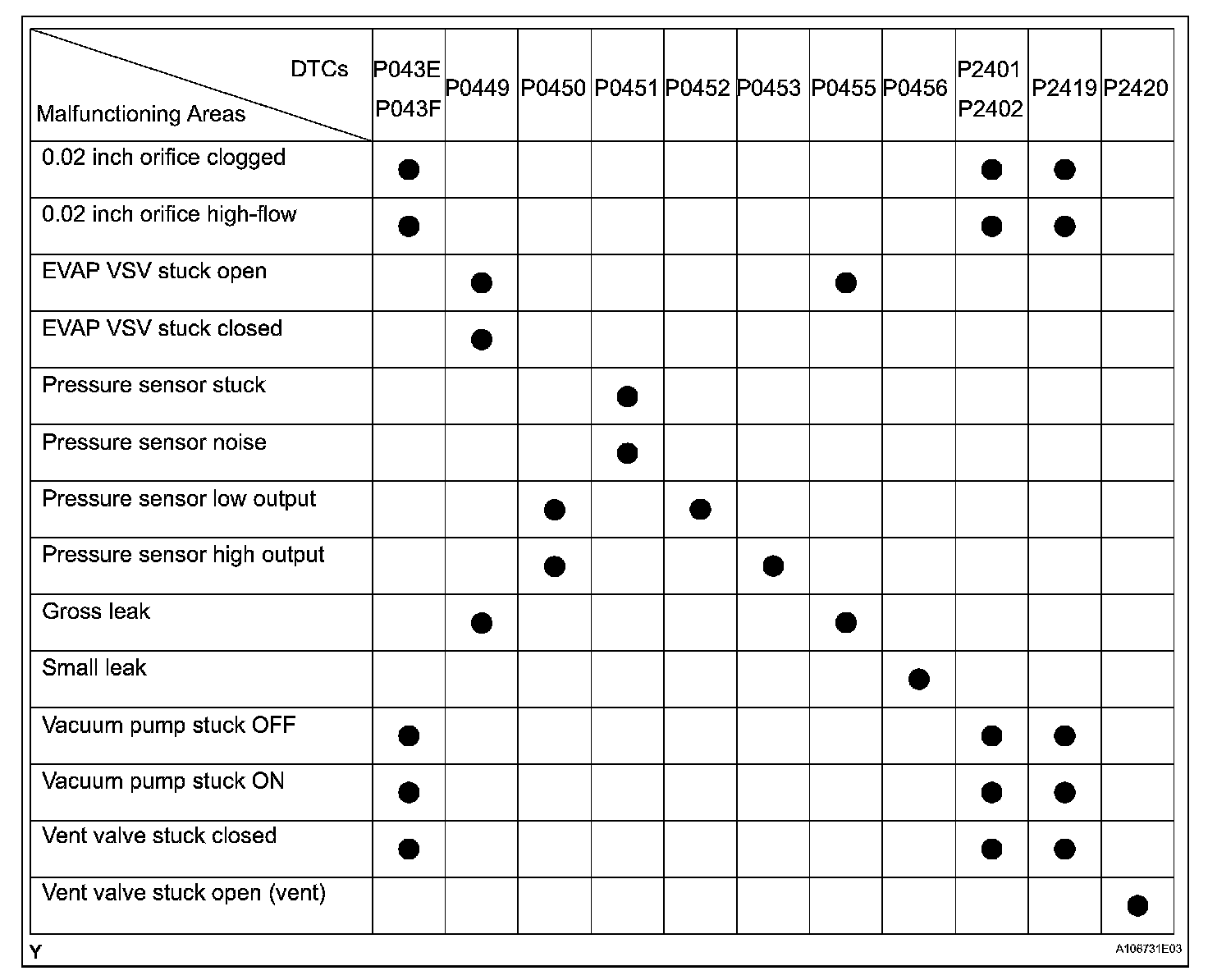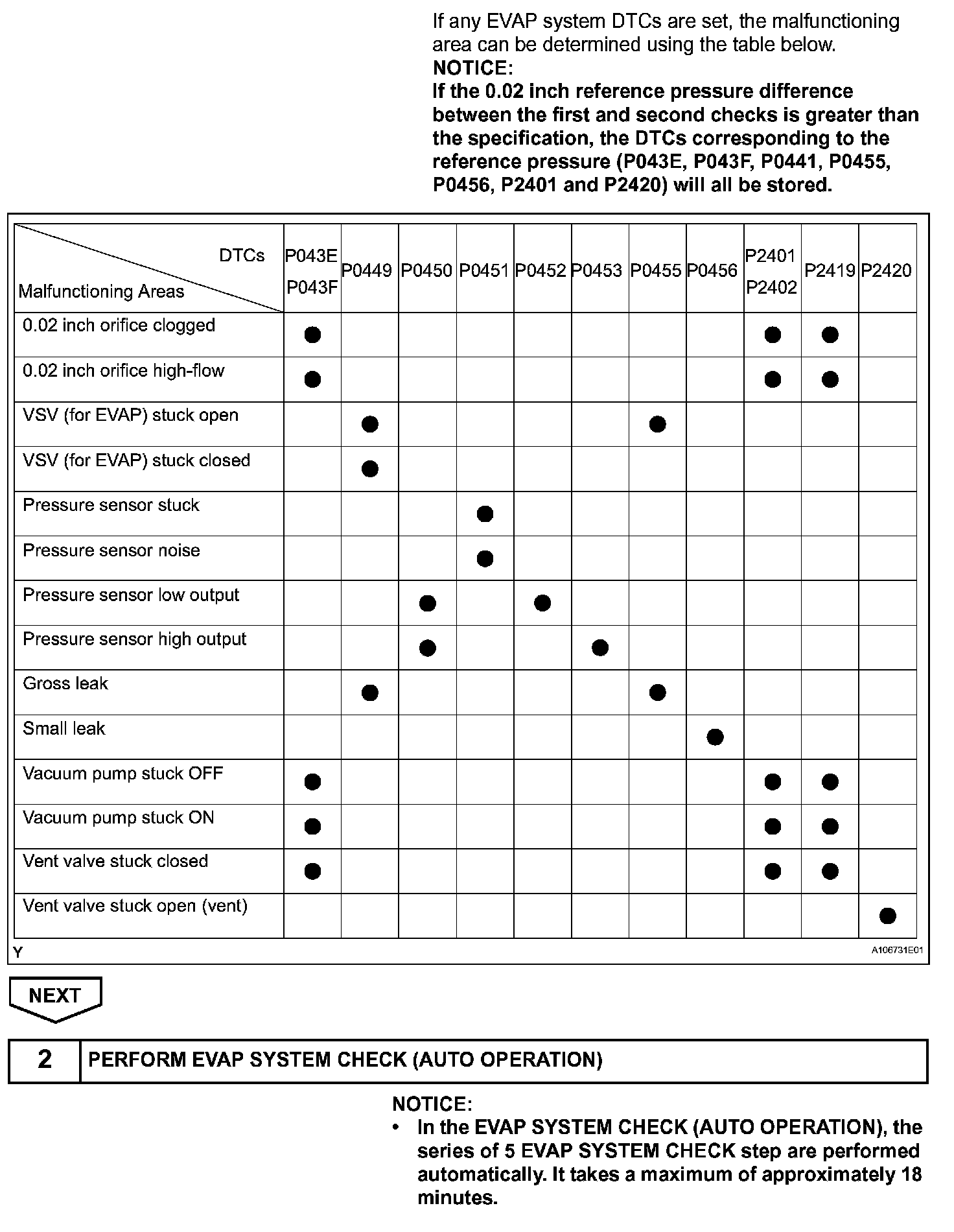 If any EVAP system DTCs are set, the malfunctioning area can be determined using the table.