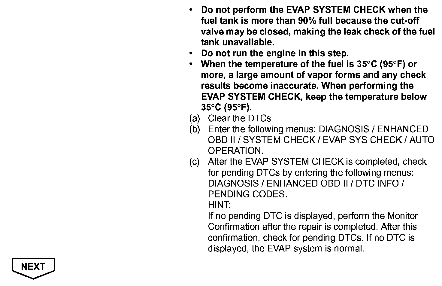 HINT: After a repair, check Monitor Status by performing the key-off monitor confirmation and purge flow monitor confirmation described below.