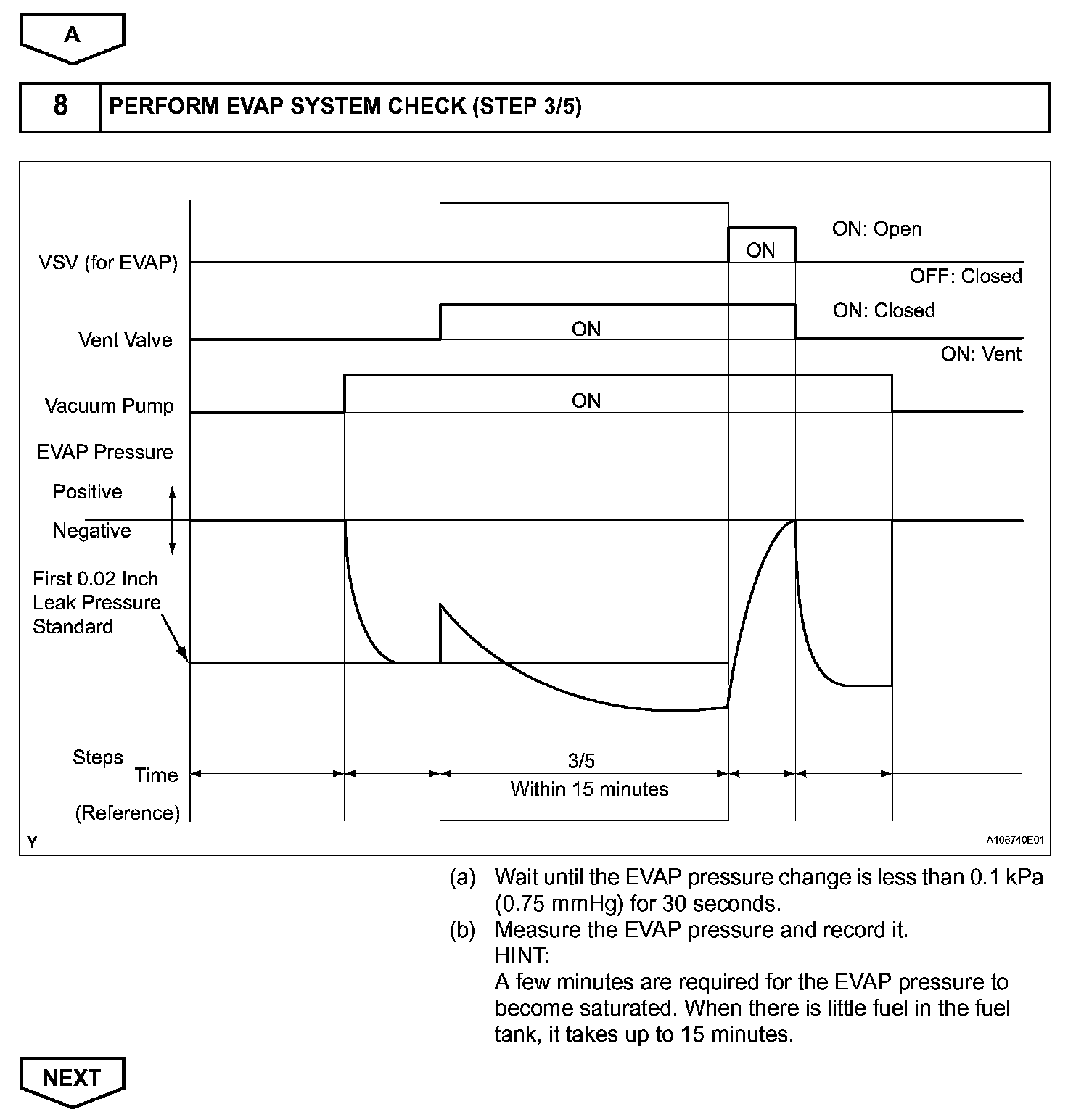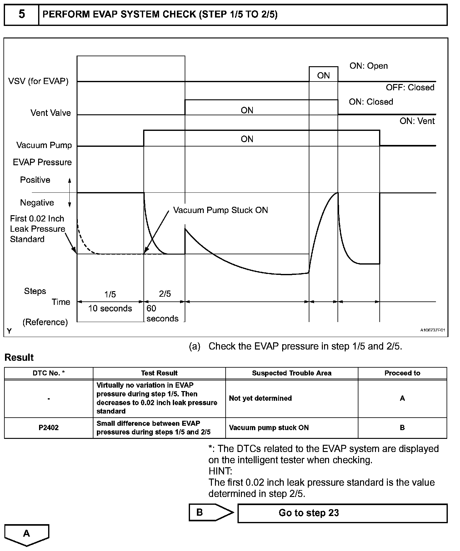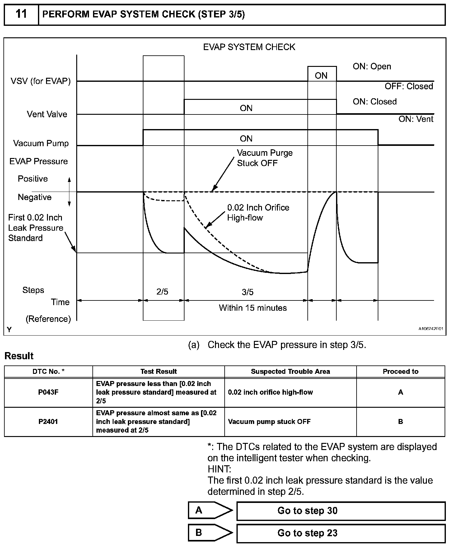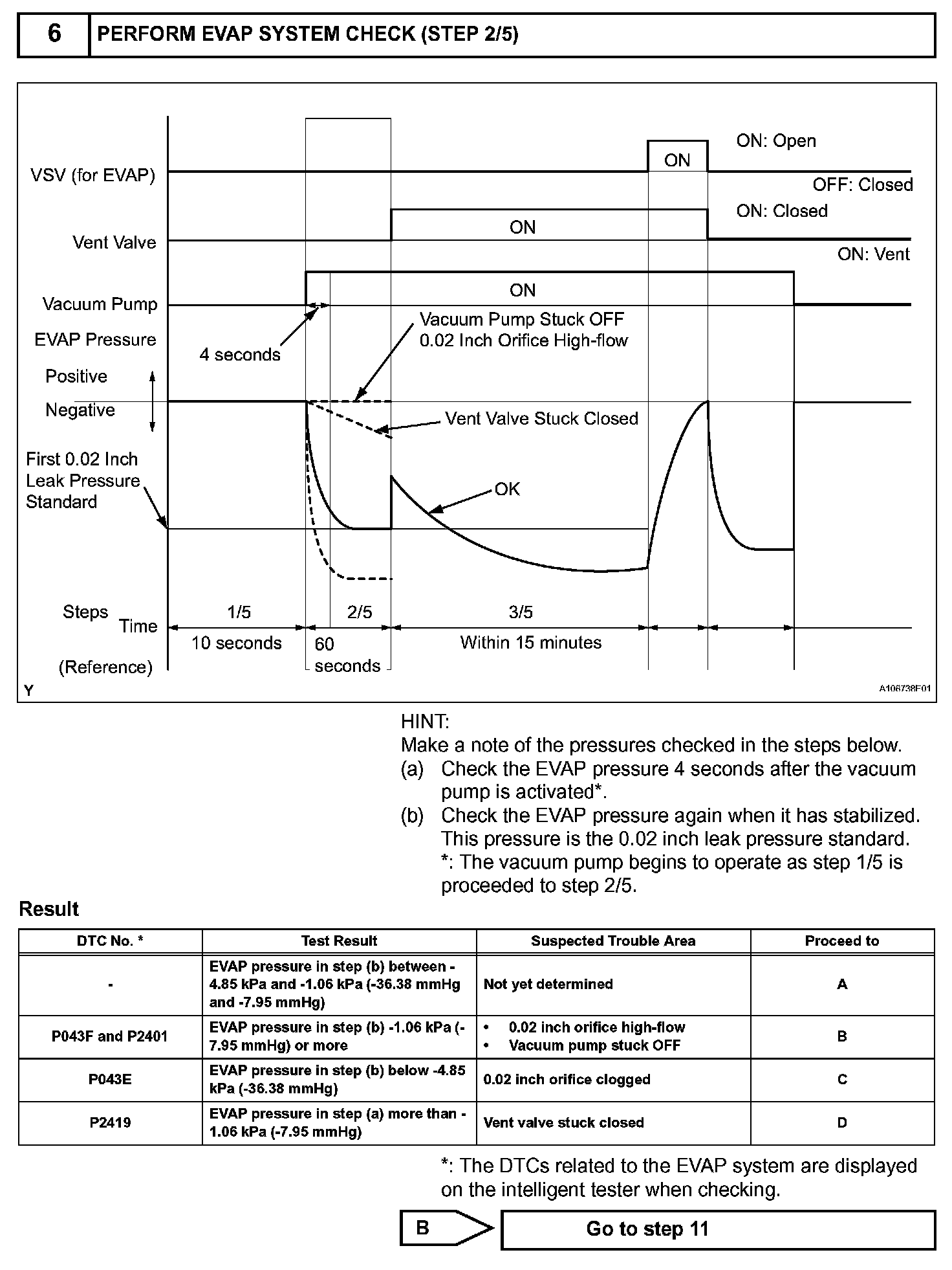 NOTE: If the 0.02 inch reference pressure difference between the first and second checks is greater than the specification, the DTCs corresponding to the reference pressure (P043E, P043F, P0441, P0455, P0456, P2401 and P2420) will all be stored.