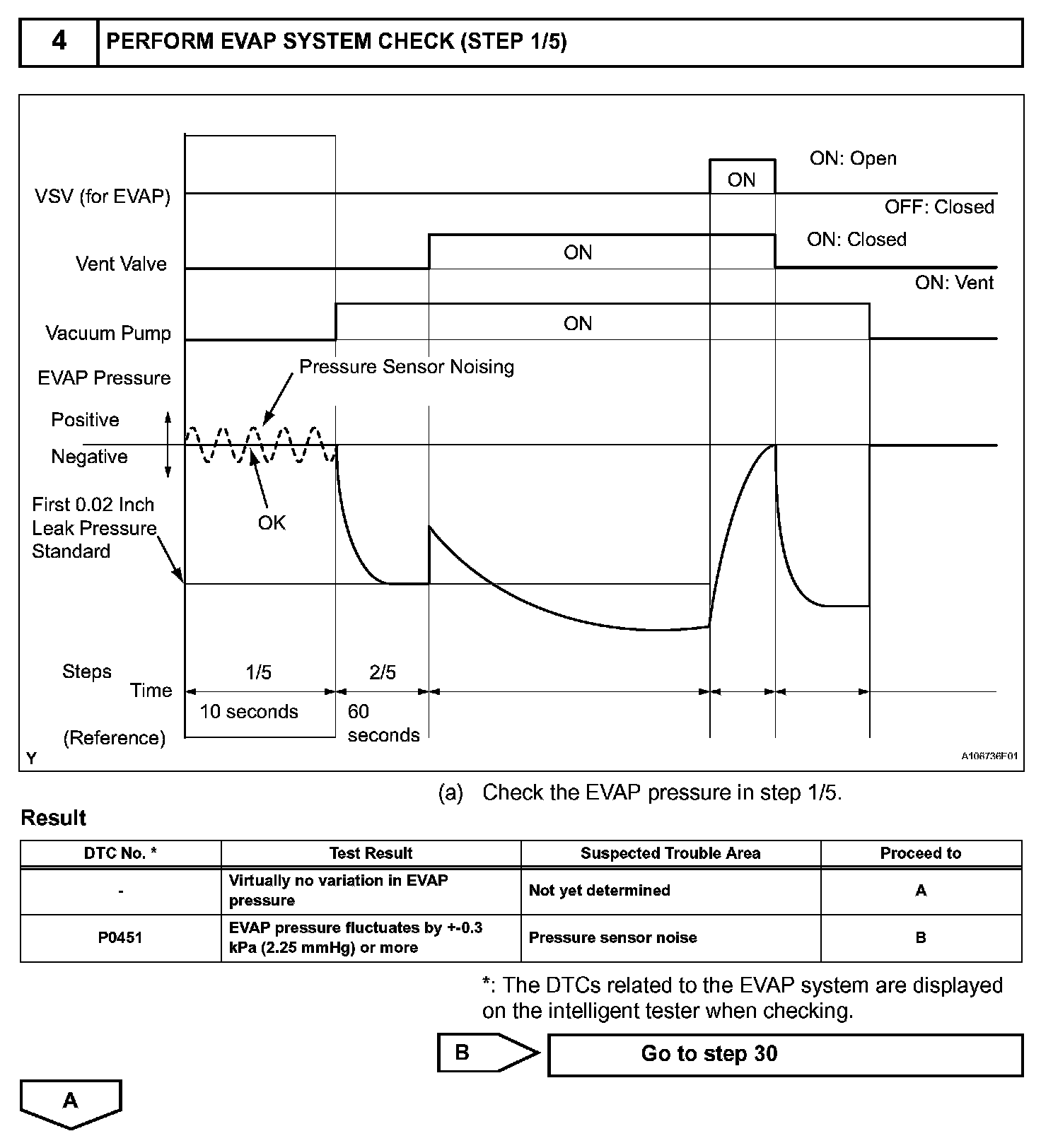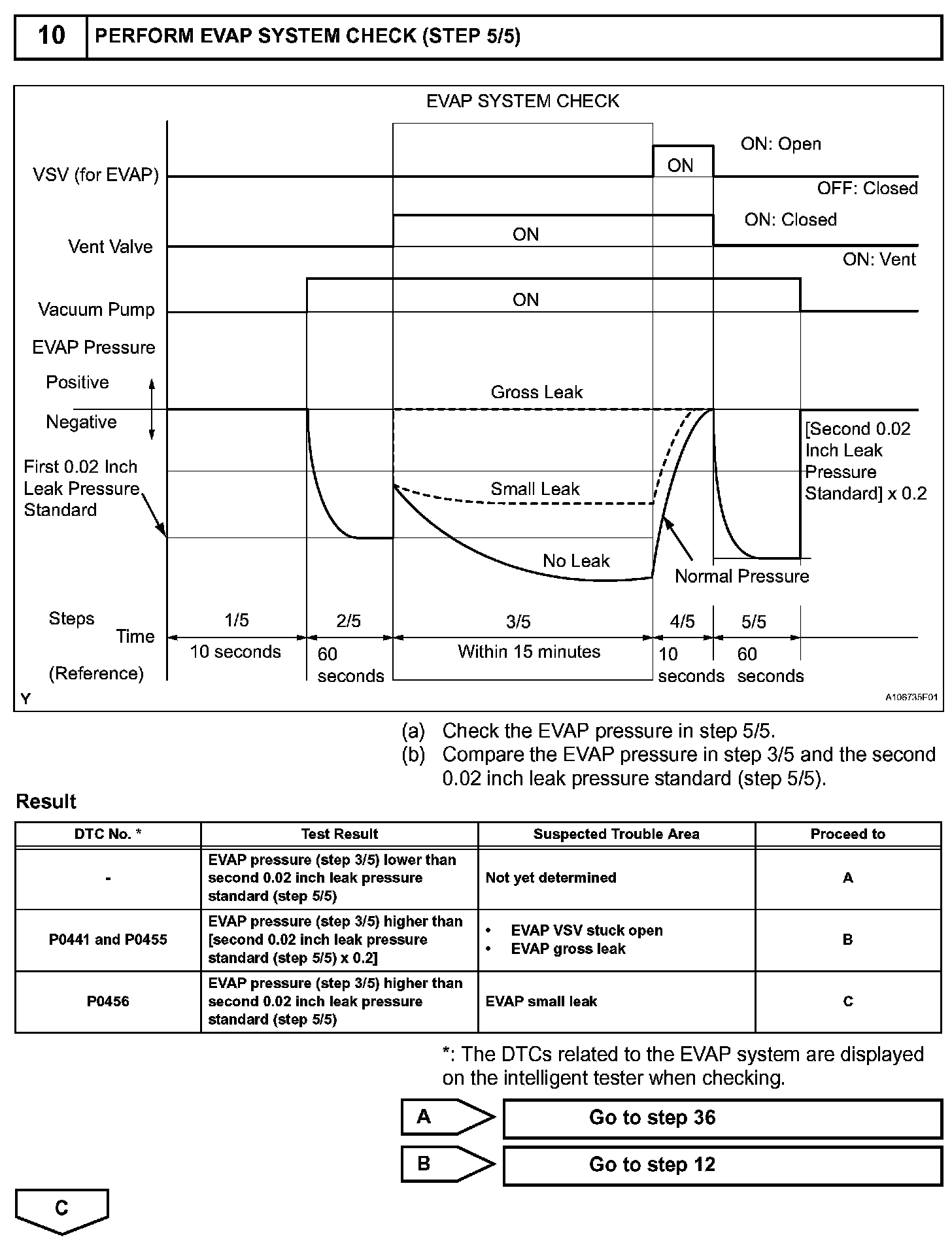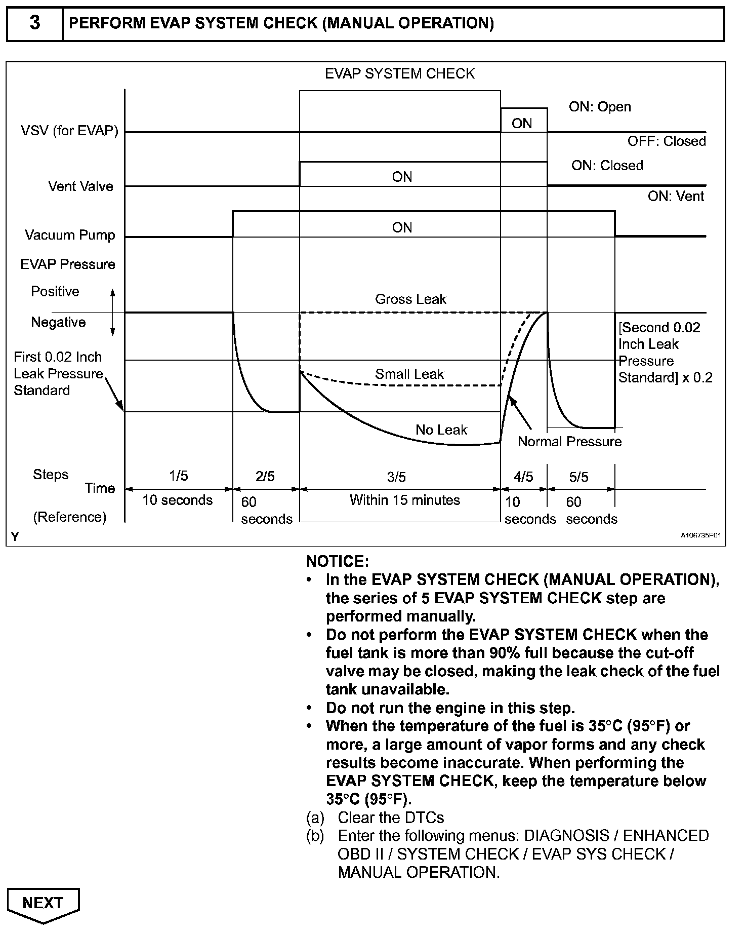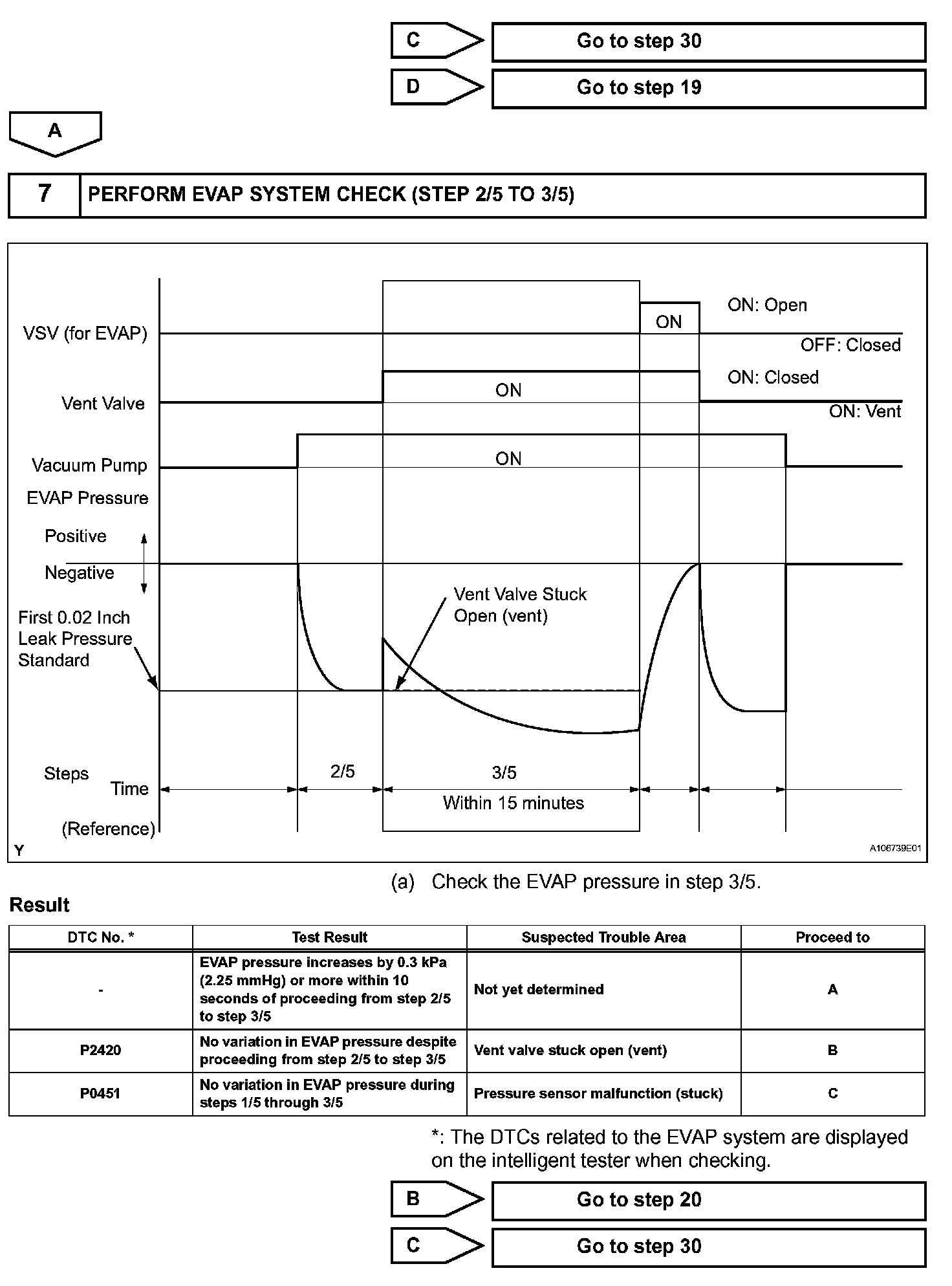 NOTE: If the 0.02 inch reference pressure difference between the first and second checks is greater than the specification, the DTCs corresponding to the reference pressure (P043E, P043F, P0441, P0455, P0456, P2401 and P2420) will all be stored.