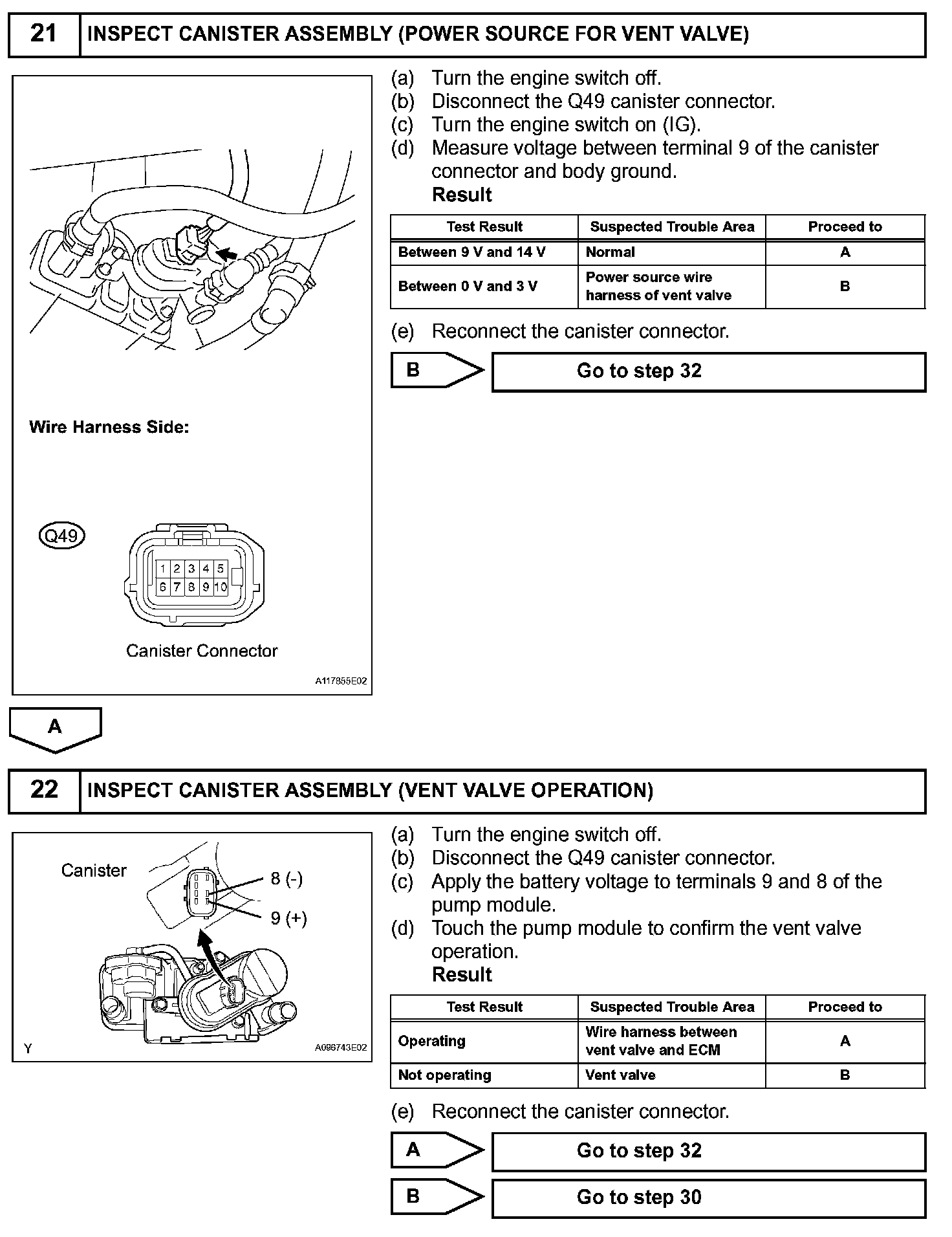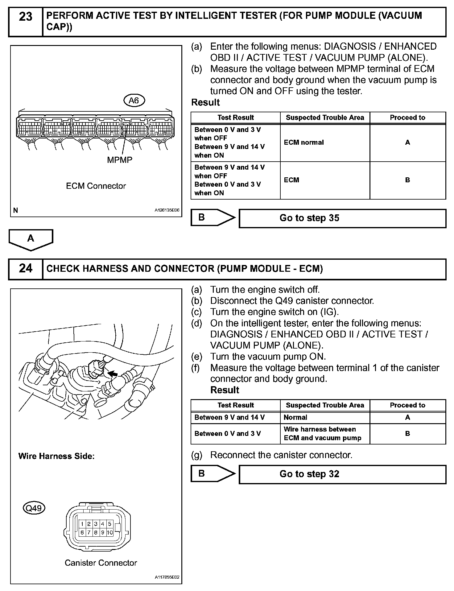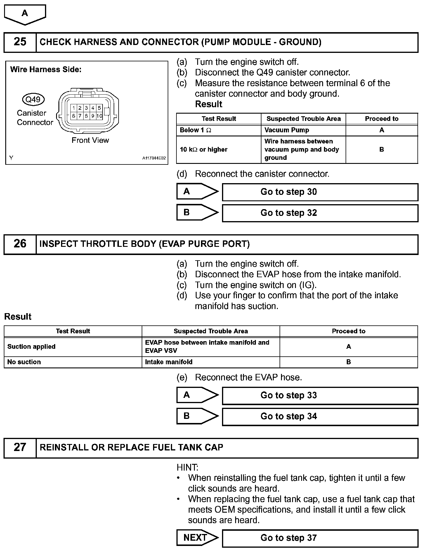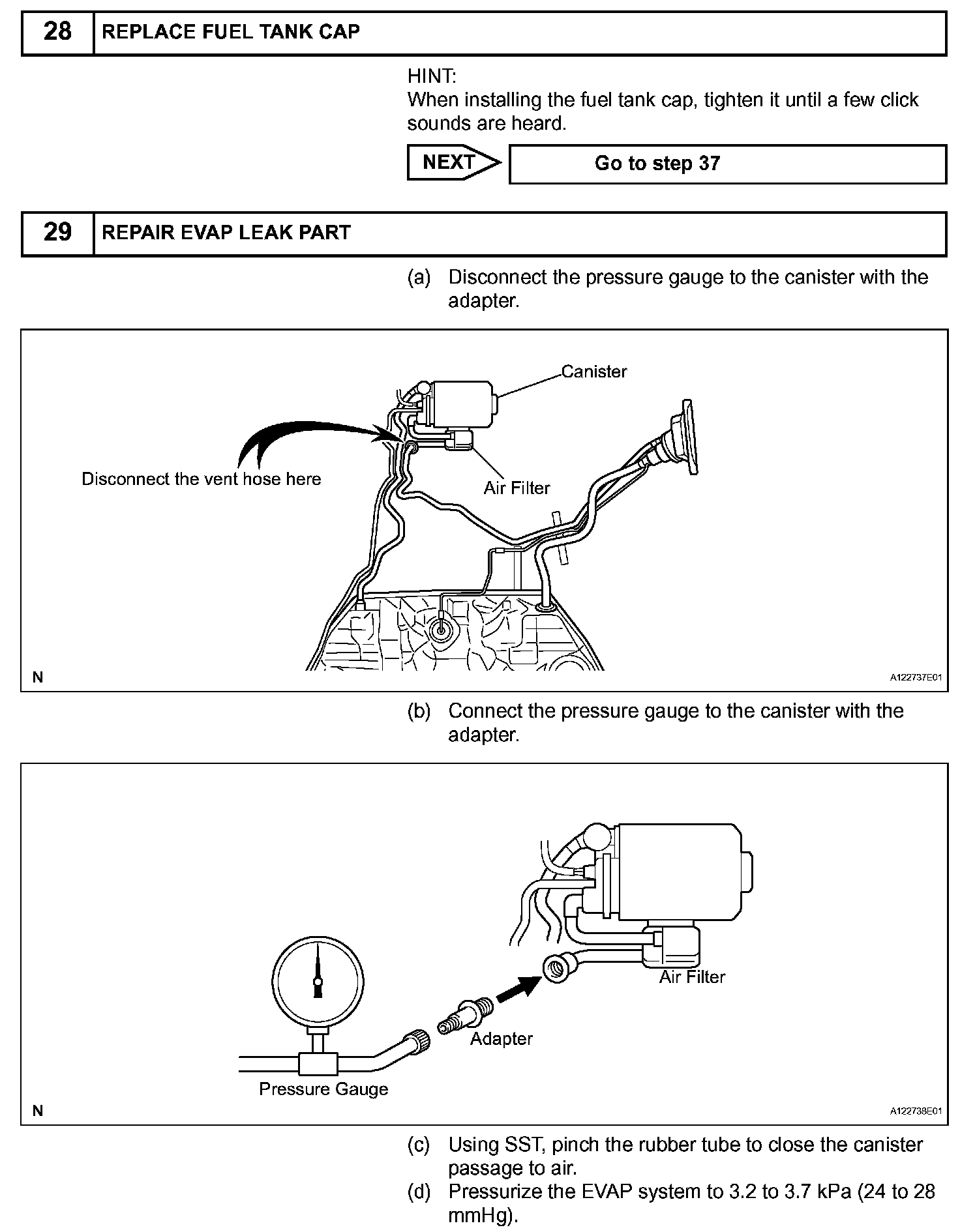 NOTE: If the 0.02 inch reference pressure difference between the first and second checks is greater than the specification, the DTCs corresponding to the reference pressure (P043E, P043F, P0441, P0455, P0456, P2401 and P2420) will all be stored.
