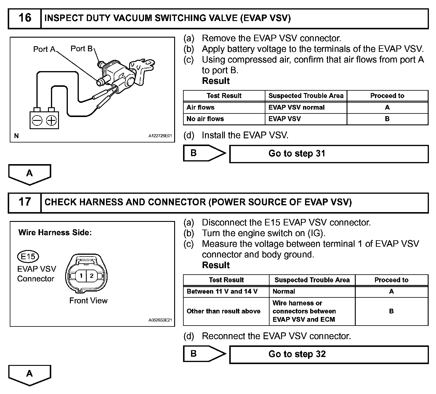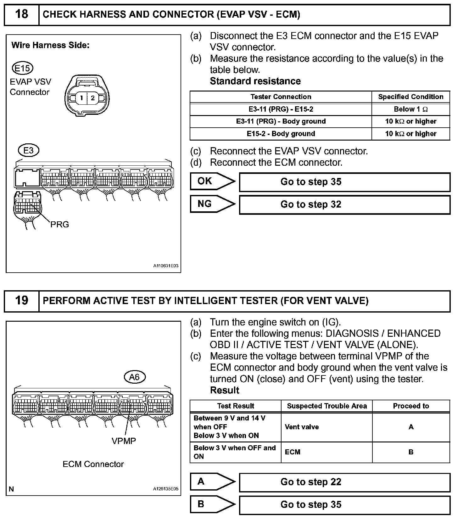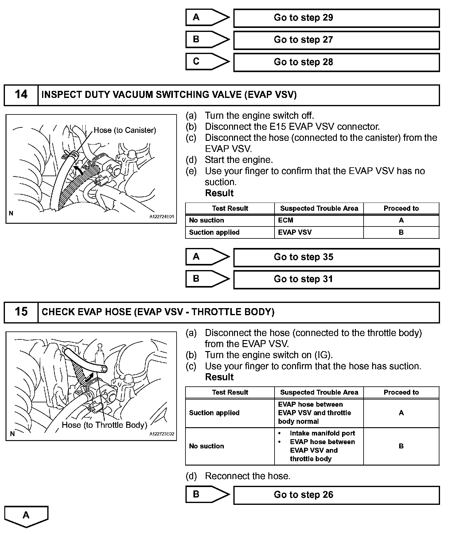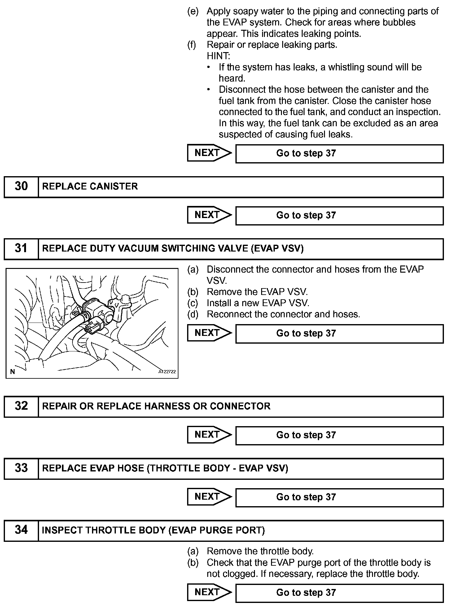 While the engine is running, if a predetermined condition (closed- loop etc.) is met, the EVAP VSV is opened by the ECM and stored fuel vapors in the canister are purged to the intake manifold. The ECM changes the duty cycle ratio of the EVAP VSV to control purge flow volume.