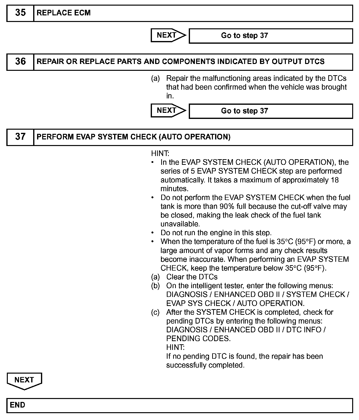 HINT: *: If the engine coolant temperature is not below 35 degrees C 5 hours after the engine switch is turned off, the monitor check starts 2 hours later. If it is still not below 35 degrees C 7 hours after the engine switch is turned off, the monitor check starts 2.5 hours later.