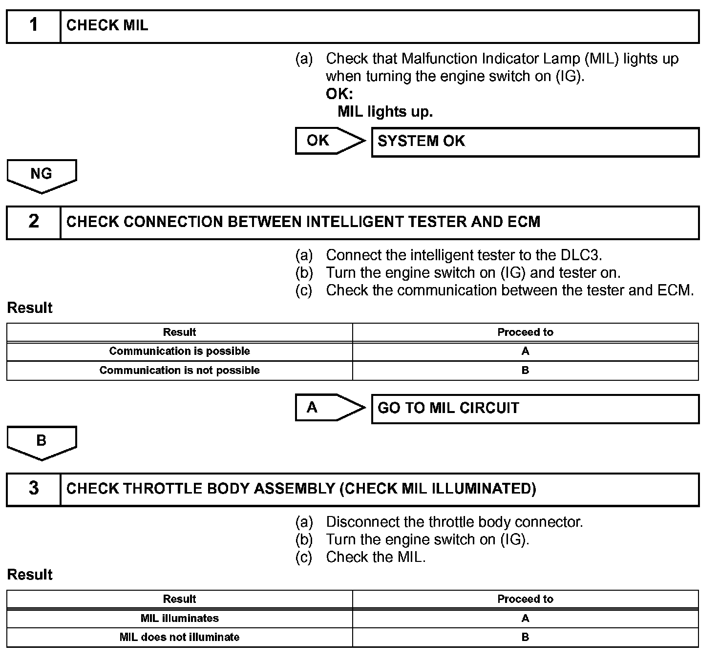 HINT: Under normal conditions, the MIL is illuminated for several seconds when the engine switch is first turned on (IG). The MIL goes off when the engine is started.