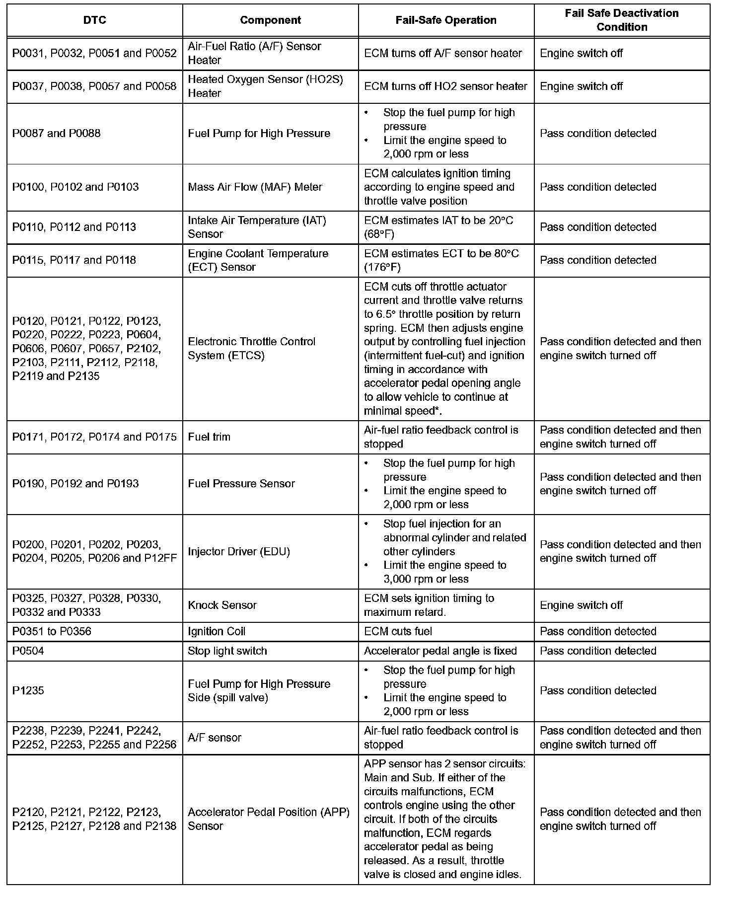 FAIL-SAFE CHARTIf any of the DTCs are set, the ECM enters fail-safe mode to allow the vehicle to be driven temporarily.