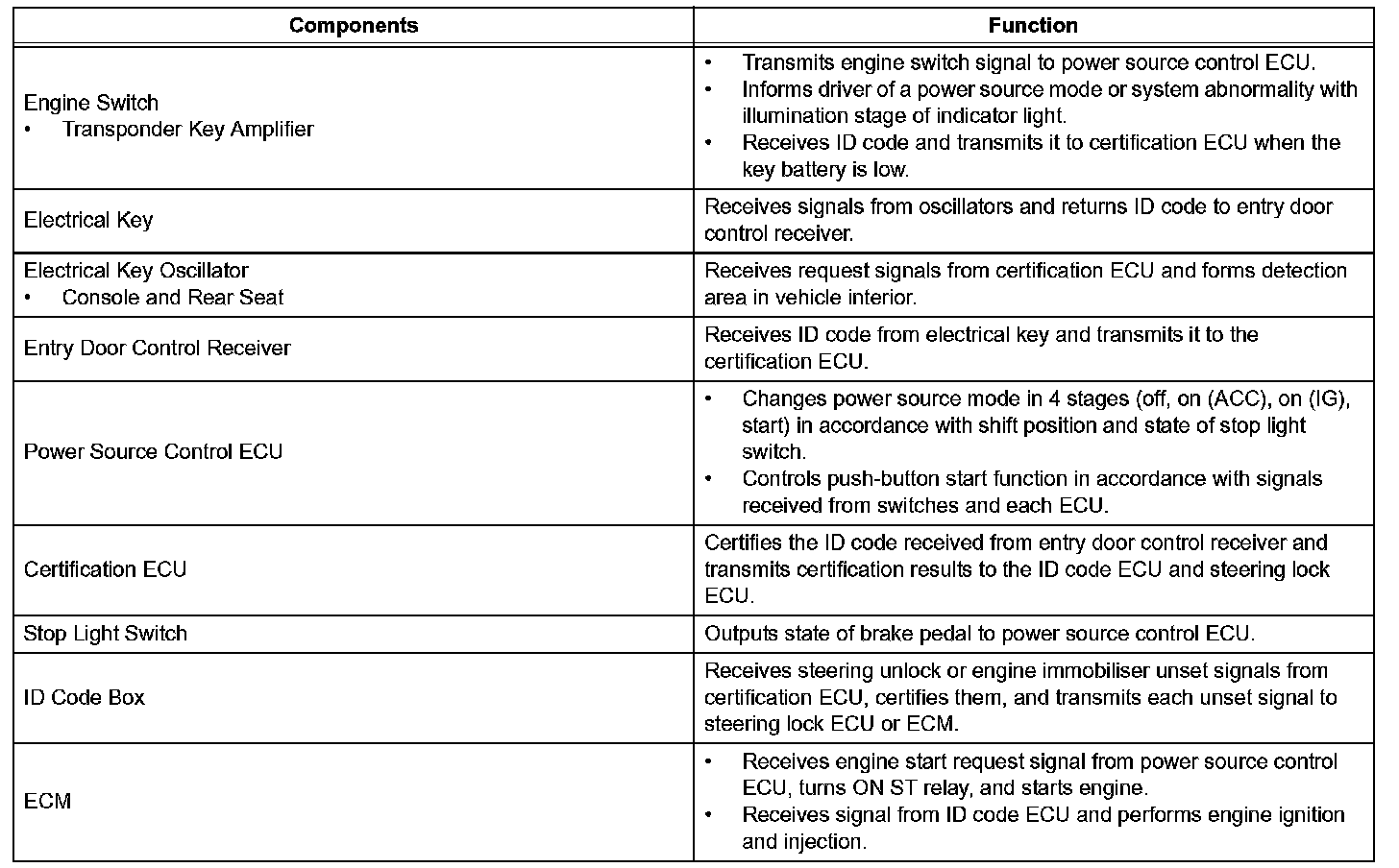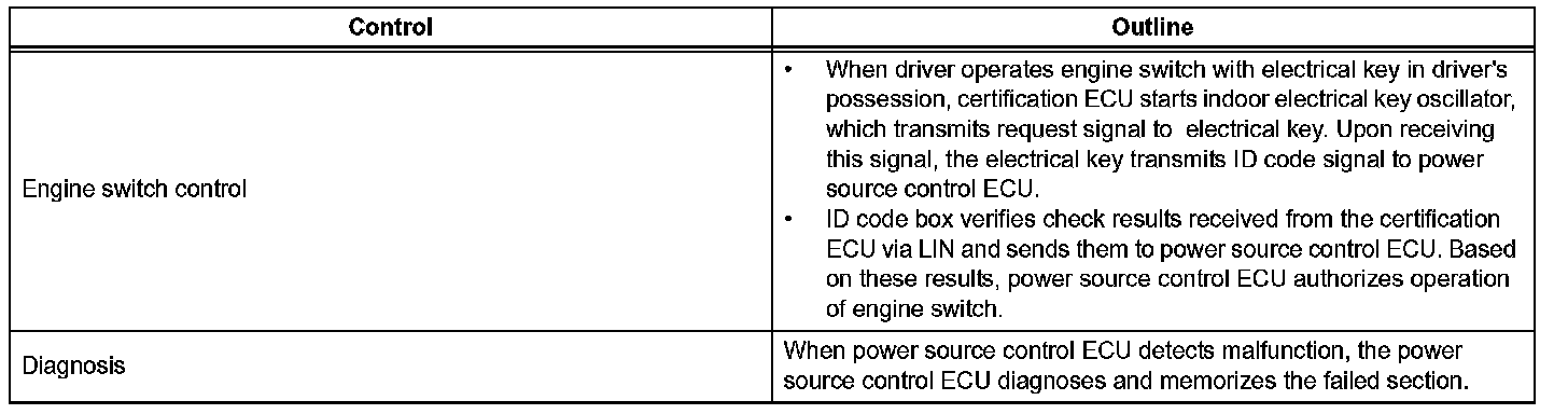 a. The push- button start uses a push- type engine switch, which the driver can operate by merely carrying the electrical key. This system consists primarily of the power source control ECU, engine switch, ID code box, steering lock ECU, electrical key, ACC relay, IG1 relay, IG2 relay and certification ECU. The power source control ECU controls the system. This function operates in cooperation with the smart access system with push- button start.