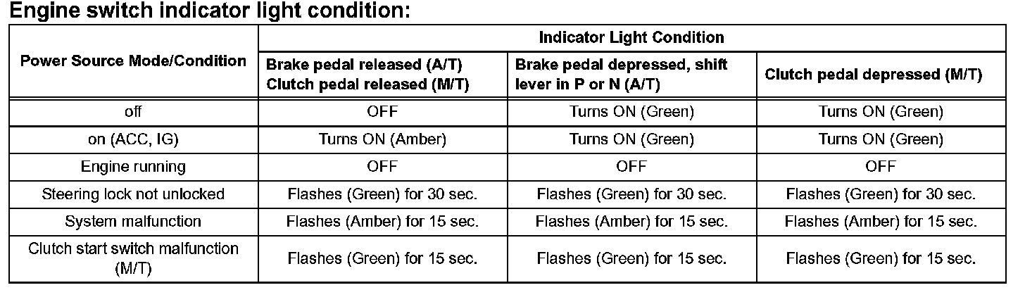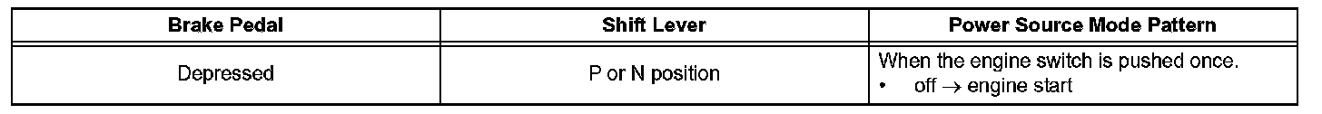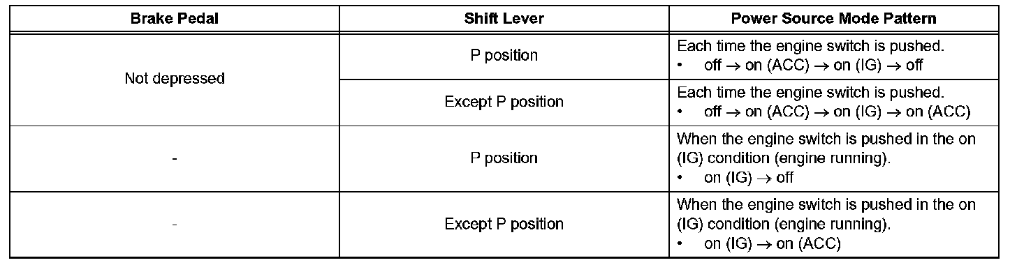 h. After the buzzer sounds, if the engine switch is pressed within 5 seconds with the brake pedal not depressed (A/T) or clutch pedal not depressed (M/ T), the power source mode changes to on (ACC) or on (IG), the same as in the normal condition.