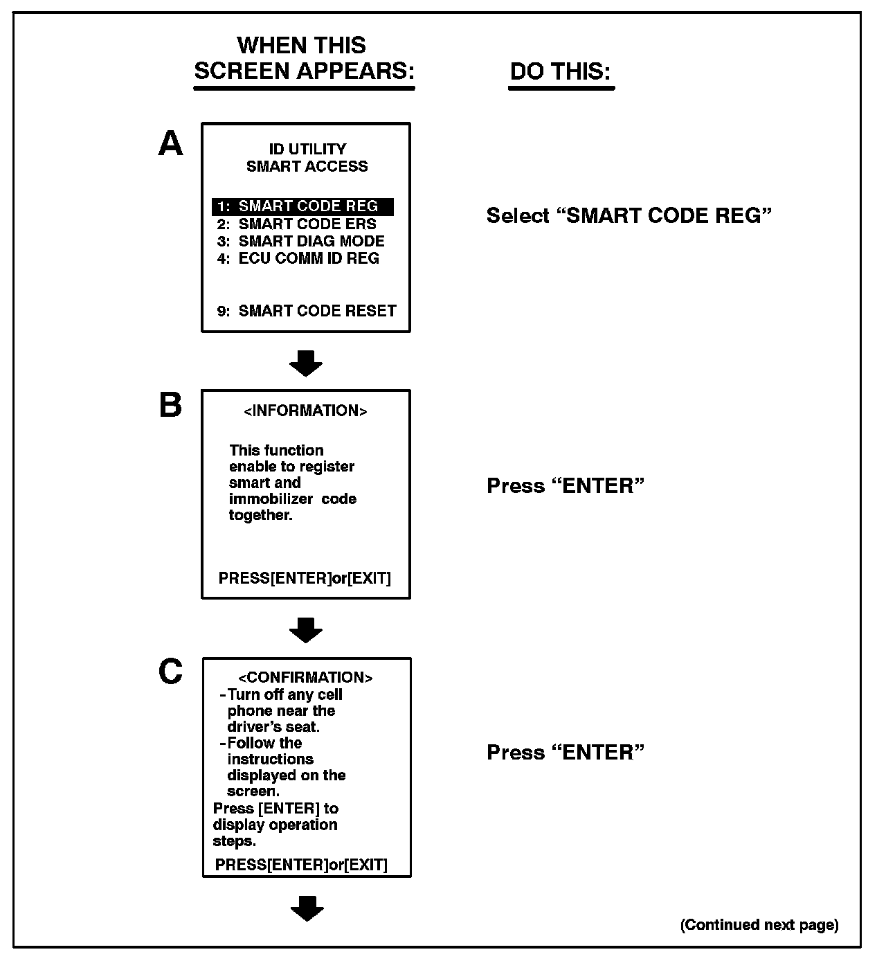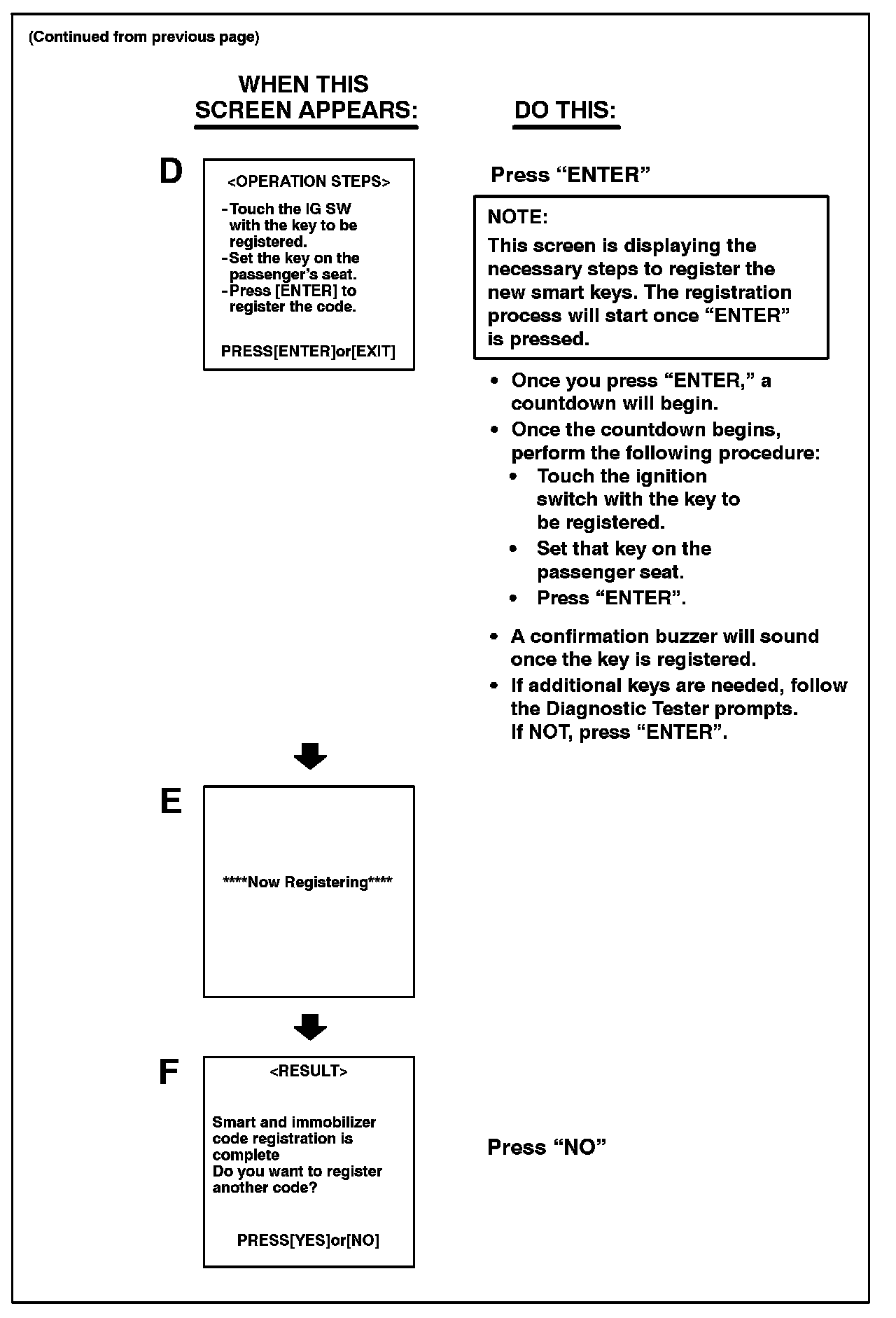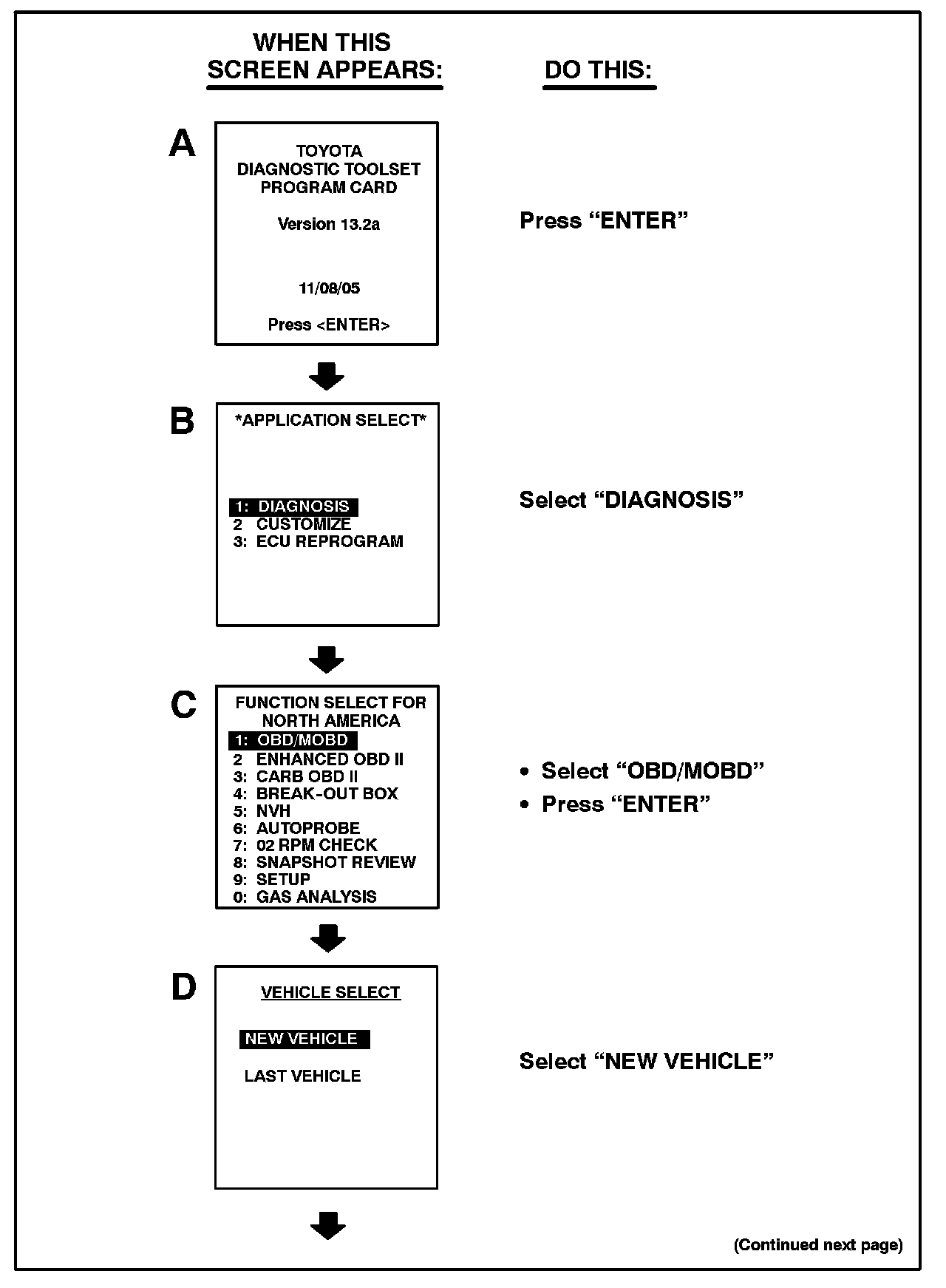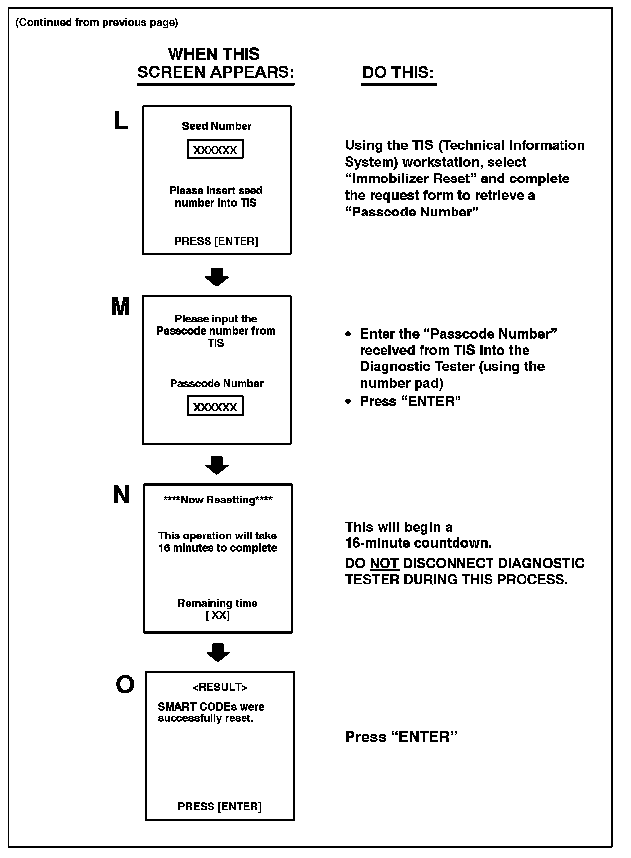 Follow the Diagnostic Tester screen flows. This procedure works best if you use the instructions under the "DO THIS" column and use the screen prints to know WHEN to perform the instructions only.