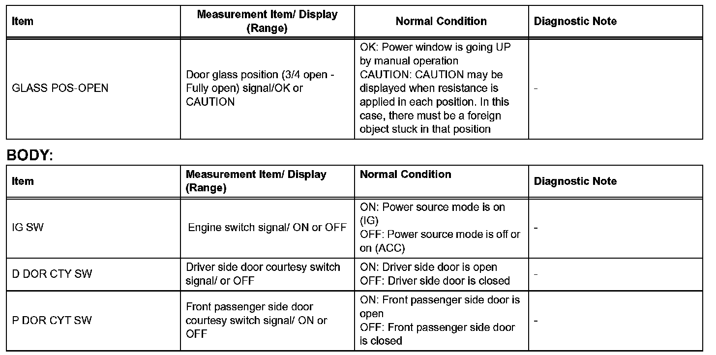 HINT: Using the DATA LIST displayed on the intelligent tester, the value of the switch, sensor, actuator, etc. can be read without part removal. Reading the DATA LIST as the first step of troubleshooting is one way to shorten the labor time.