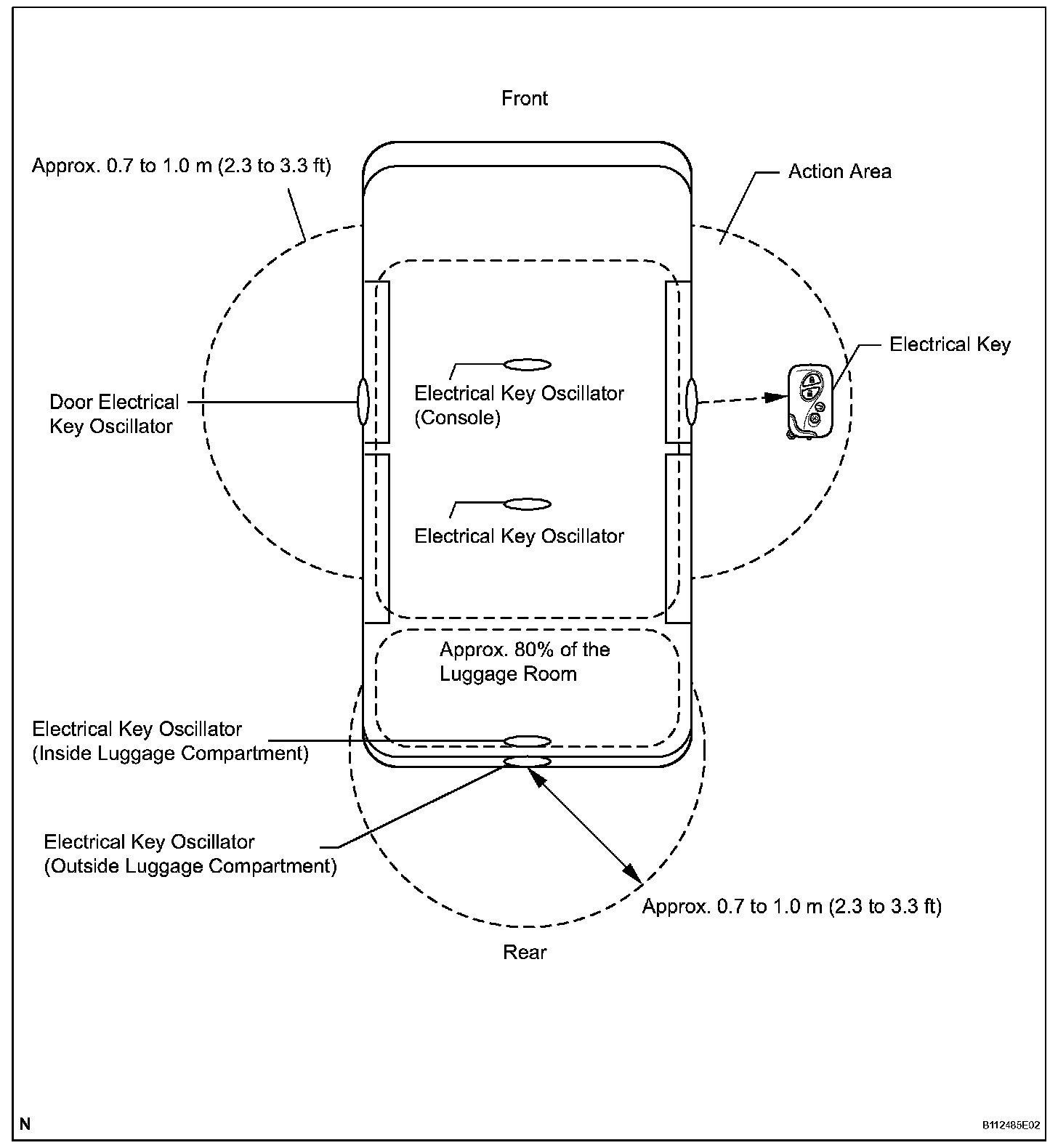 b. Oscillator (each door oscillator, front and rear indoor oscillator, luggage compartment inner oscillator, luggage compartment outer oscillator) Each oscillator transmits the request signal received from the certification ECU, and forms an electrical key detection area to detect the presence of an electrical key. The detection area formed by each door oscillator and luggage compartment outer oscillator is approximately 0.7 to 1.0 m (2.3 to 3.3 ft.) from the outside handle of each door or the center of the rear bumper.