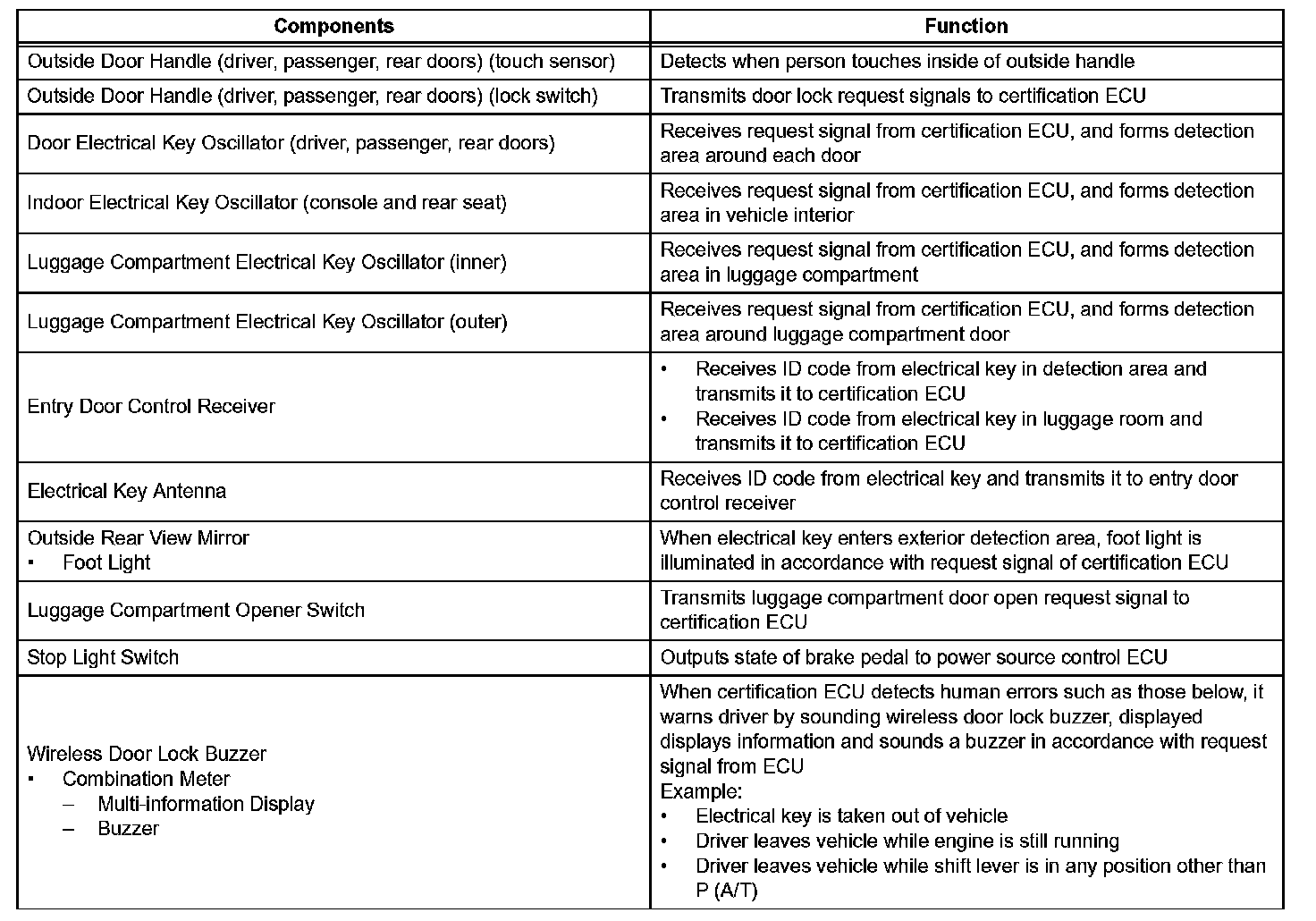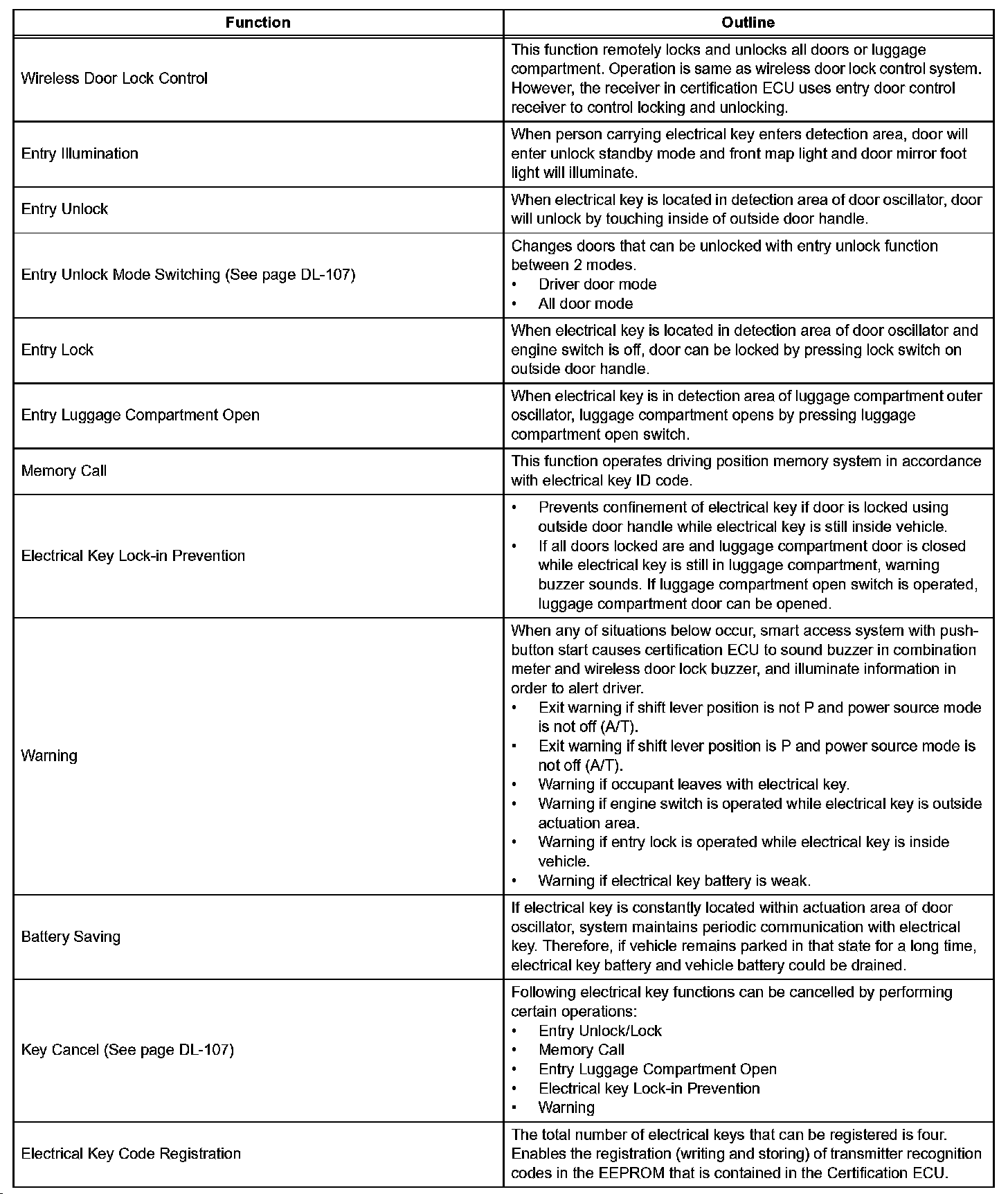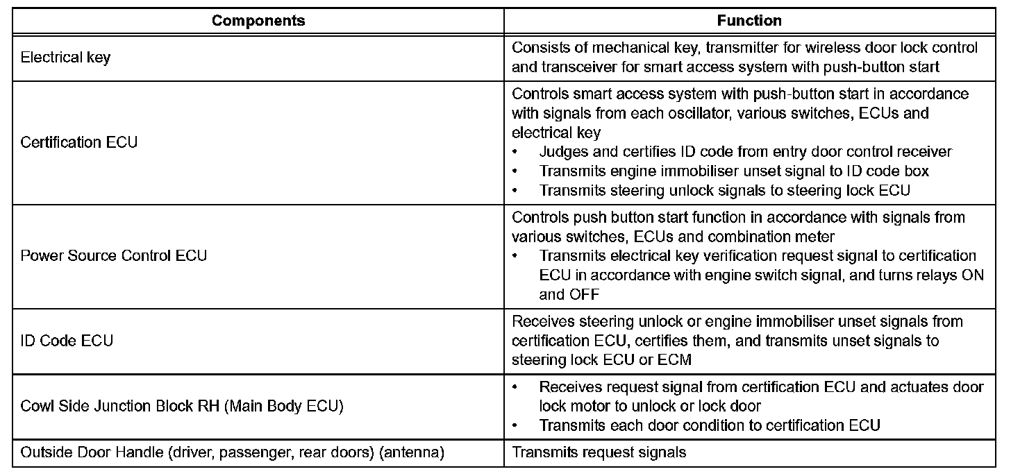 a. In addition to conventional mechanical key and wireless door lock control functions, the entry and start system enables door locking/unlocking, steering lock releasing, engine starting and luggage compartment door opening without operating the electrical key. The only requirement is that the electrical key is in the user's possession.