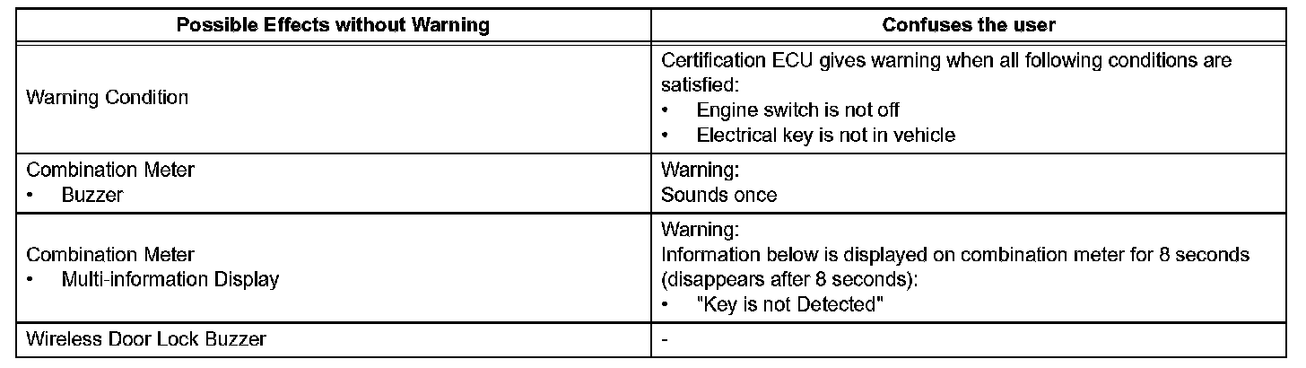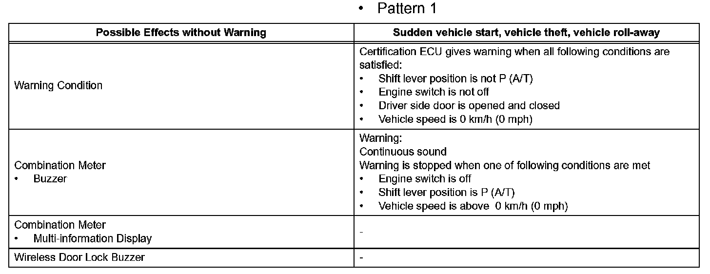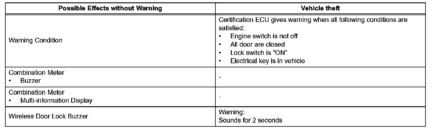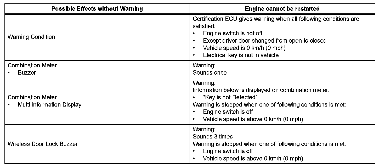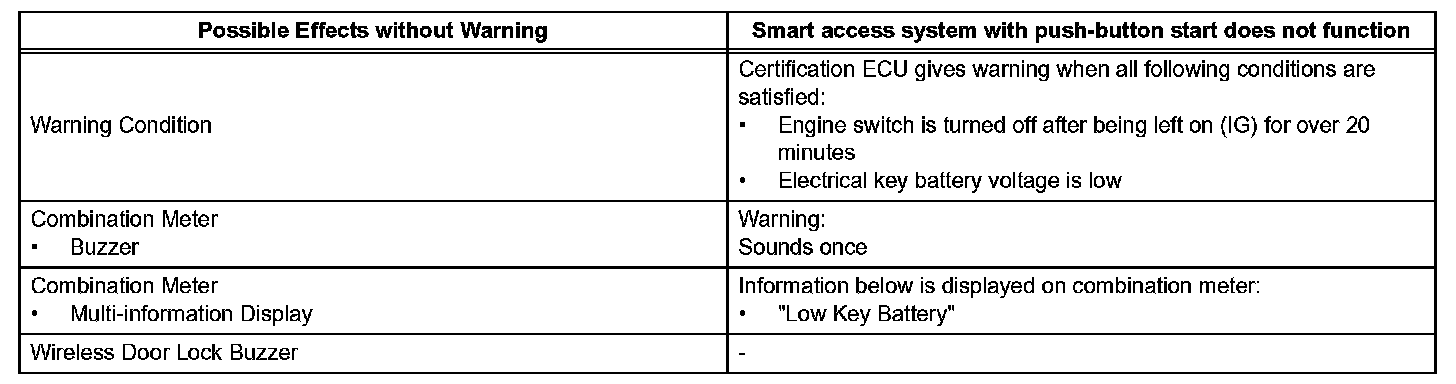 When any of the situations occur, the smart access system with push-button start causes the certification ECU to sound the buzzer in the combination meter and the wireless door lock buzzer, and illuminate the combination meter's multi-information display in order to alert the driver.