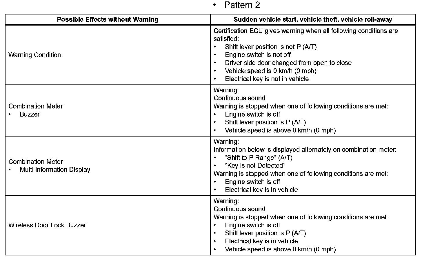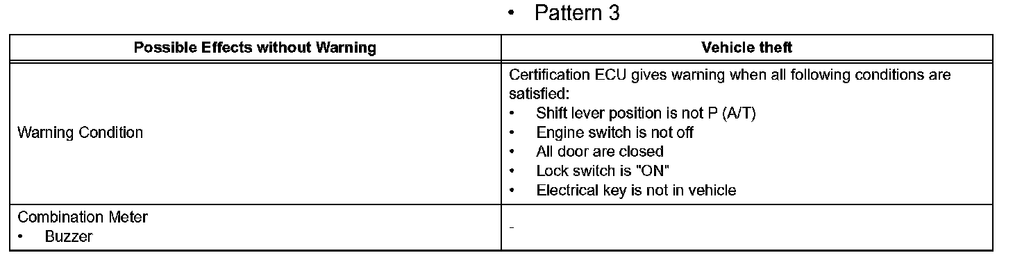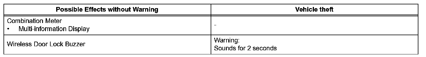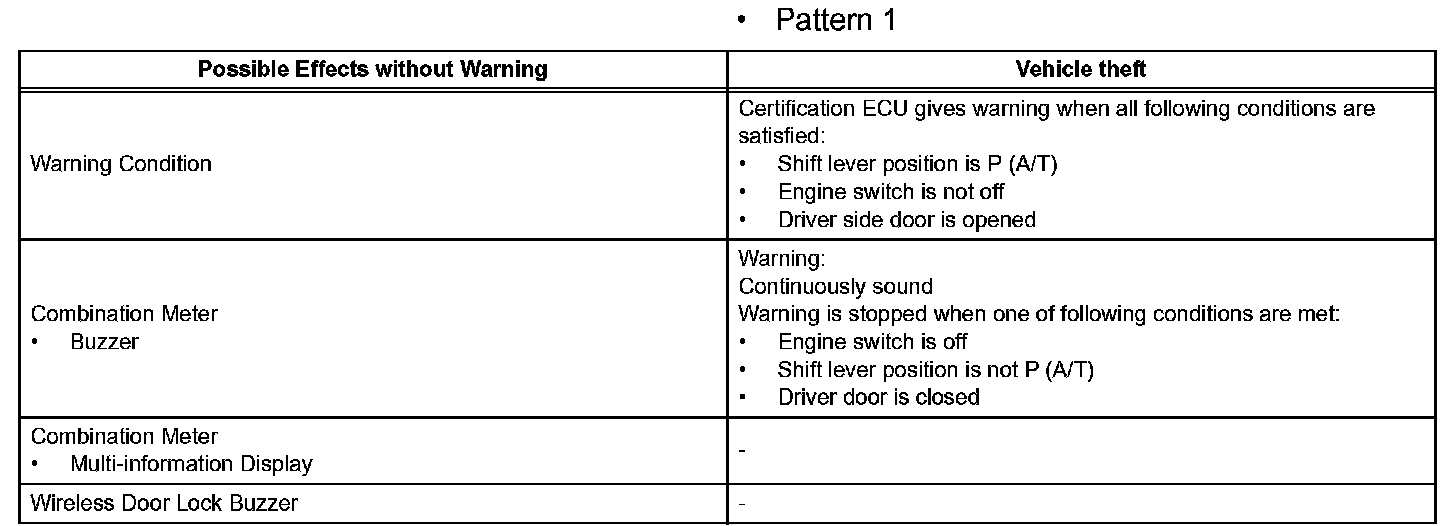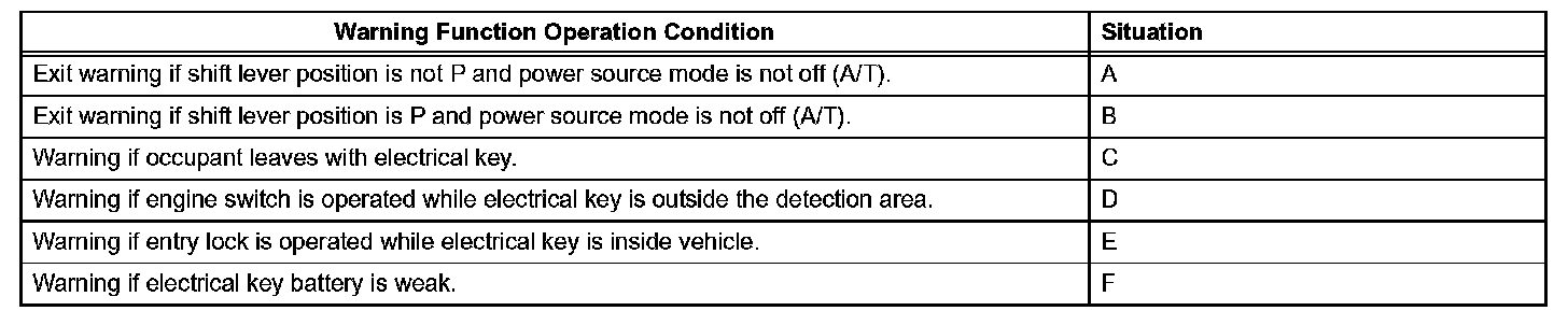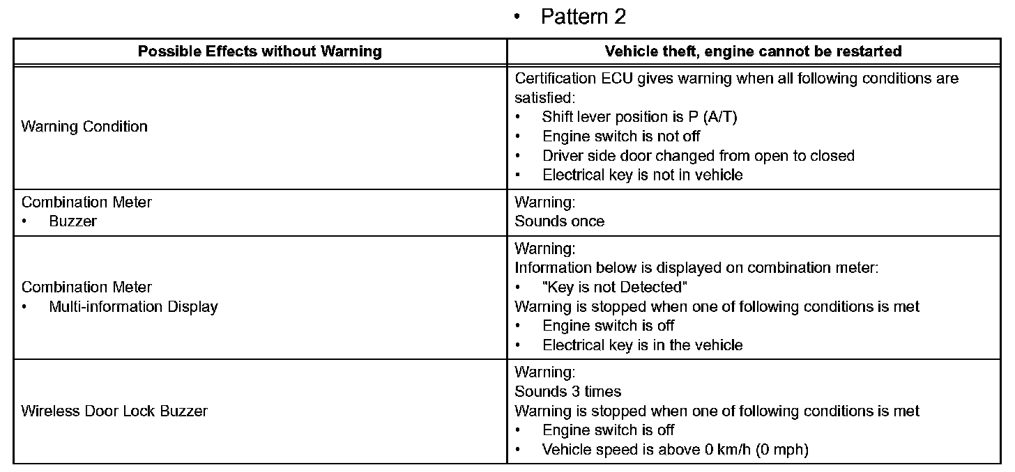 When any of the situations occur, the smart access system with push-button start causes the certification ECU to sound the buzzer in the combination meter and the wireless door lock buzzer, and illuminate the combination meter's multi-information display in order to alert the driver.