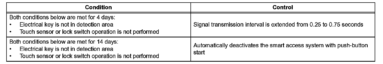 In the smart access system with push-button start, signals are emitted outside of the vehicle at a prescribed interval (0.25 seconds) when the doors are locked. Therefore, the vehicle battery could be drained if the vehicle remains parked for a long time. For this reason, the controls listed in the image are affected.