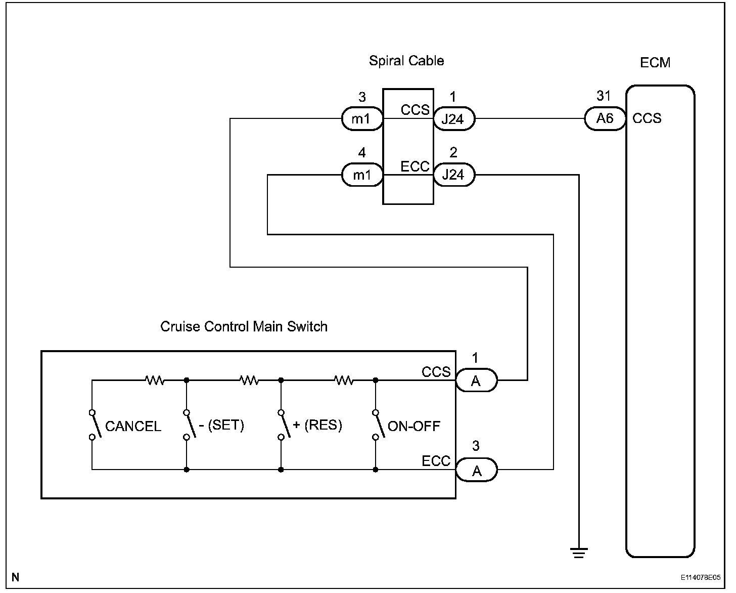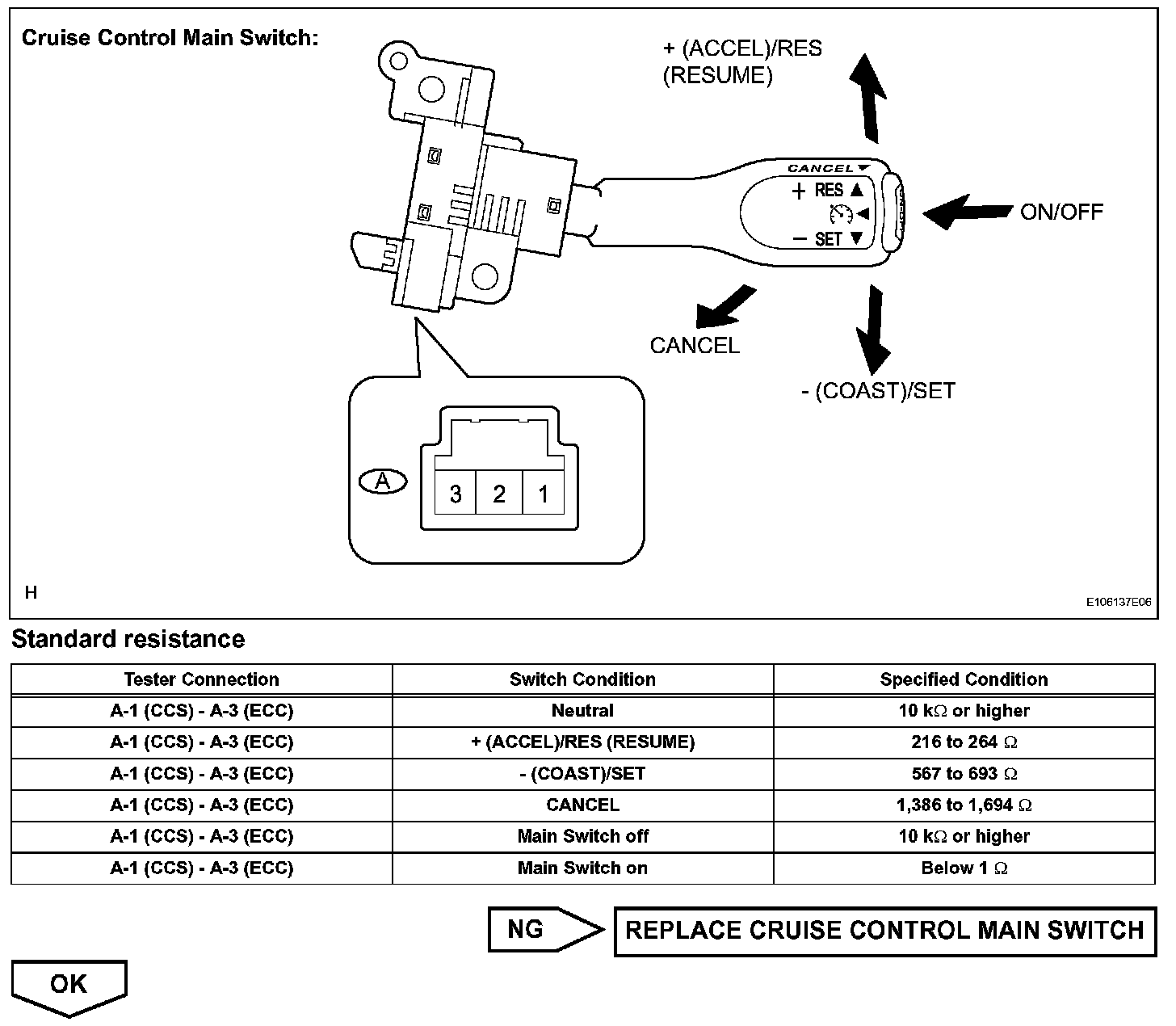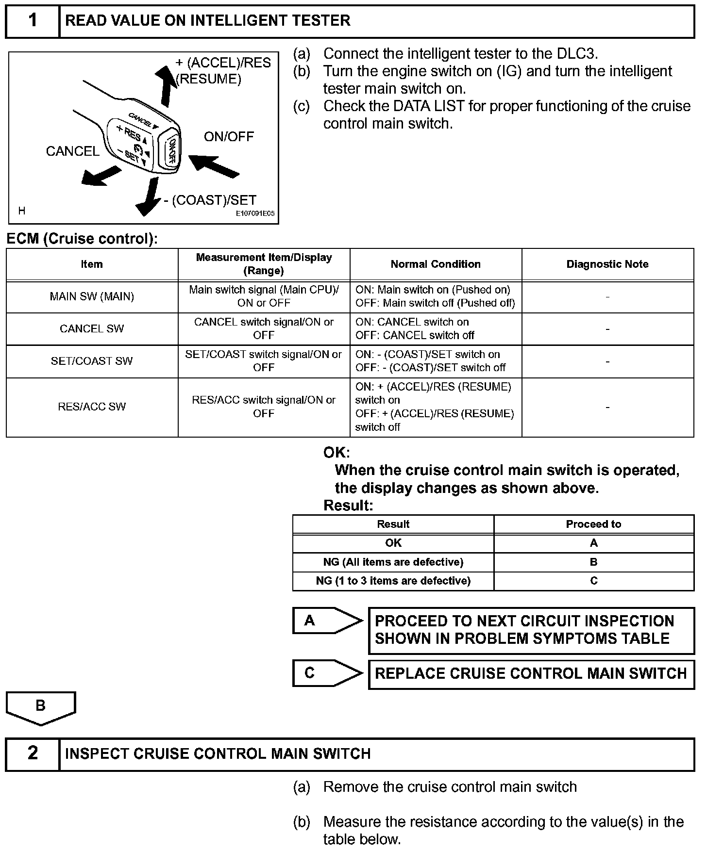 The cruise control main switch operates 7 functions: SET, - (COAST), TAP-DOWN, RES (RESUME), + (ACCEL), TAP-UP, and CANCEL. The SET, TAP-DOWN, and - (COAST) functions, and the RES (RESUME), TAP-UP, and + (ACCEL) functions are operated with the same switch. The cruise control main switch is an automatic return type switch which turns on only while operating it in the direction of each arrow and turns off after releasing it. The internal contact point of the cruise control main switch is turned on with the switch operation. Then the ECM reads the voltage value that has been changed by the switch operation to control SET, - (COAST), RES (RESUME), + (ACCEL), and CANCEL.