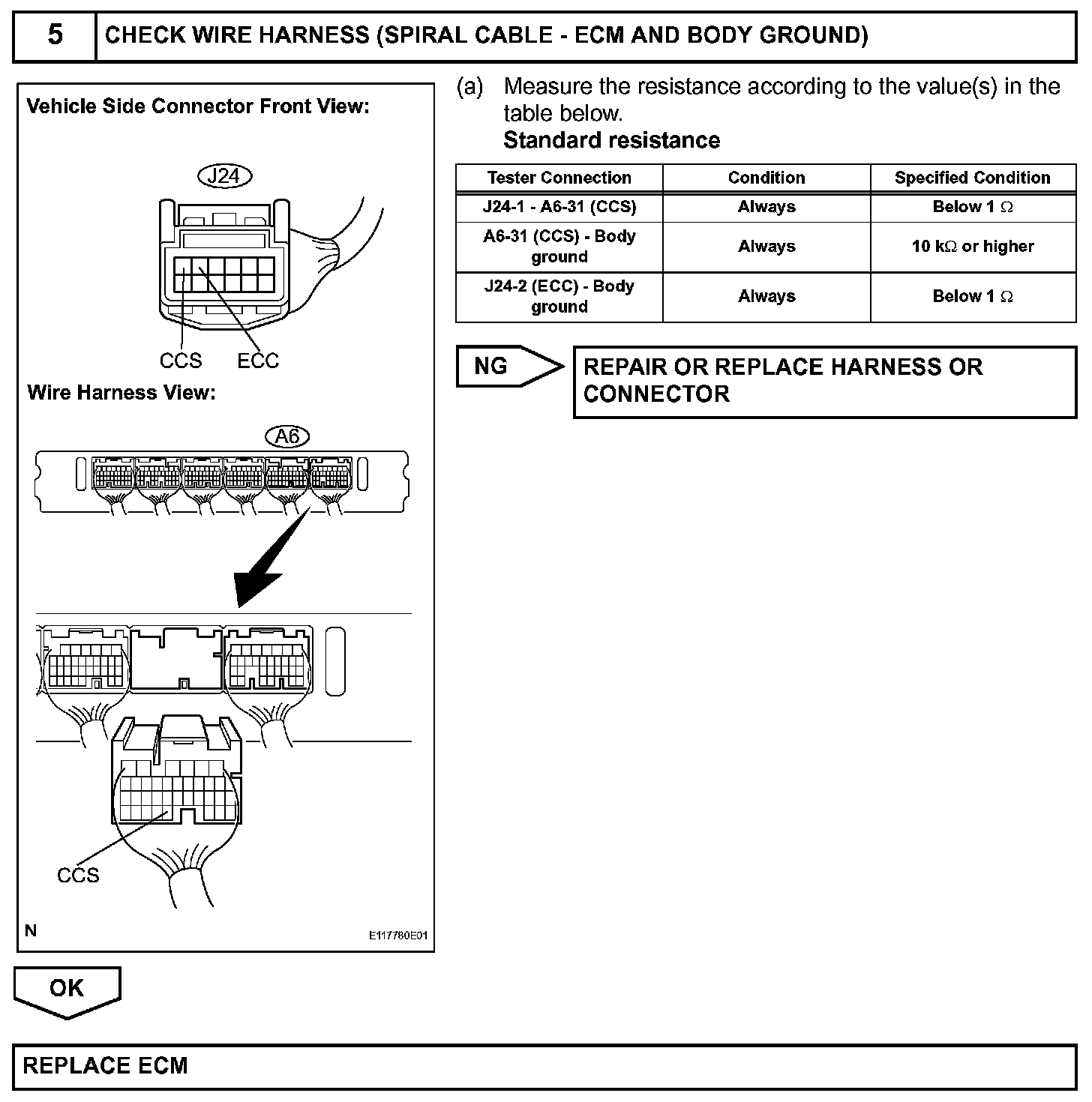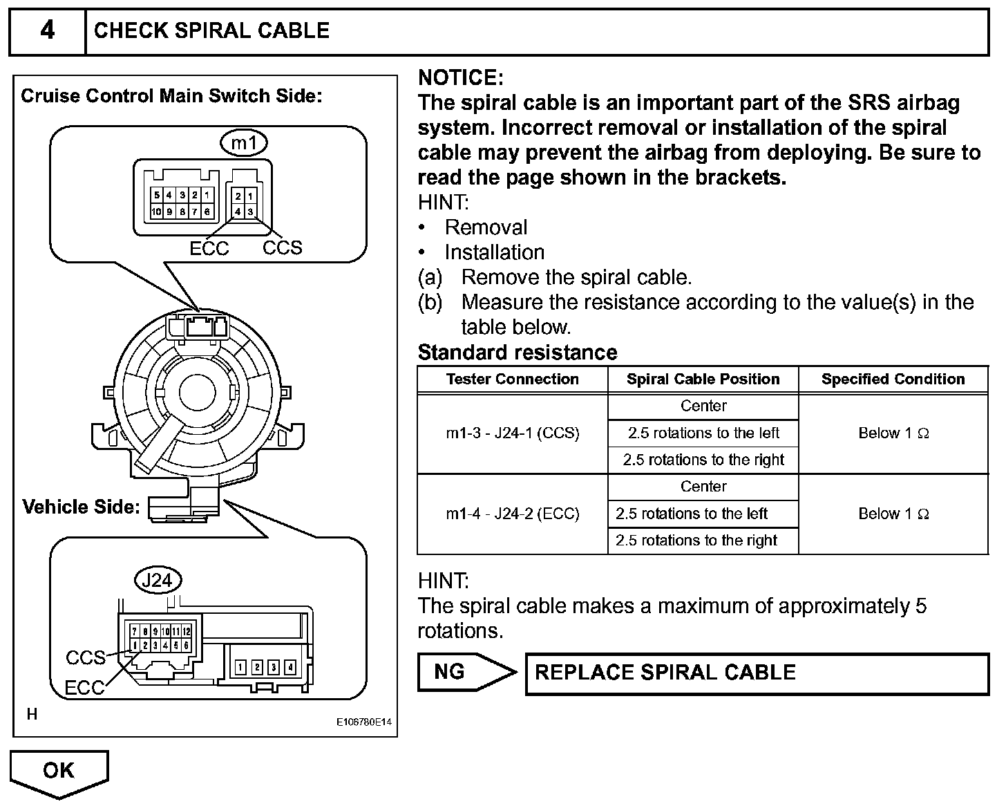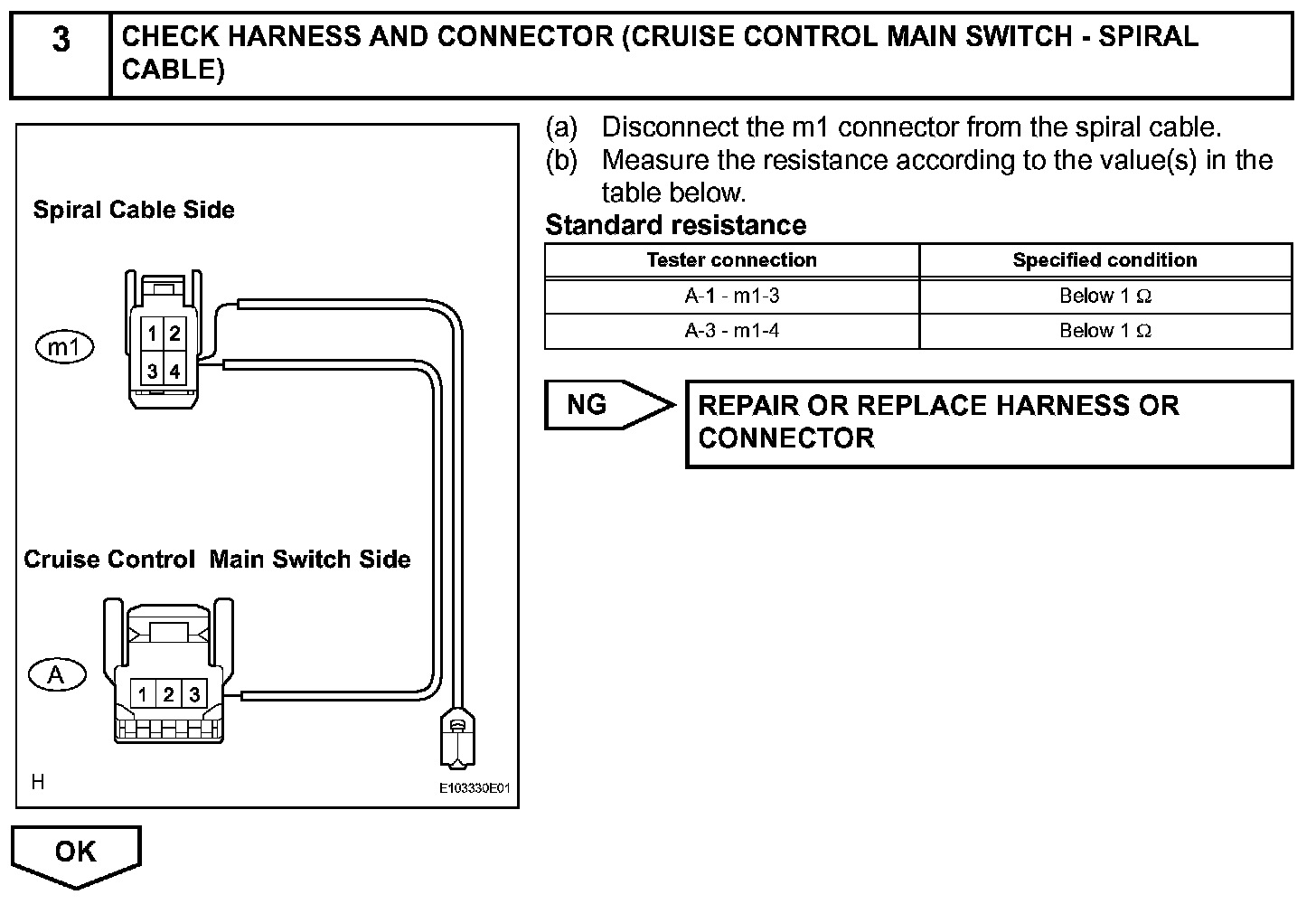 The cruise control main switch operates 7 functions: SET, - (COAST), TAP-DOWN, RES (RESUME), + (ACCEL), TAP-UP, and CANCEL. The SET, TAP-DOWN, and - (COAST) functions, and the RES (RESUME), TAP-UP, and + (ACCEL) functions are operated with the same switch. The cruise control main switch is an automatic return type switch which turns on only while operating it in the direction of each arrow and turns off after releasing it. The internal contact point of the cruise control main switch is turned on with the switch operation. Then the ECM reads the voltage value that has been changed by the switch operation to control SET, - (COAST), RES (RESUME), + (ACCEL), and CANCEL.