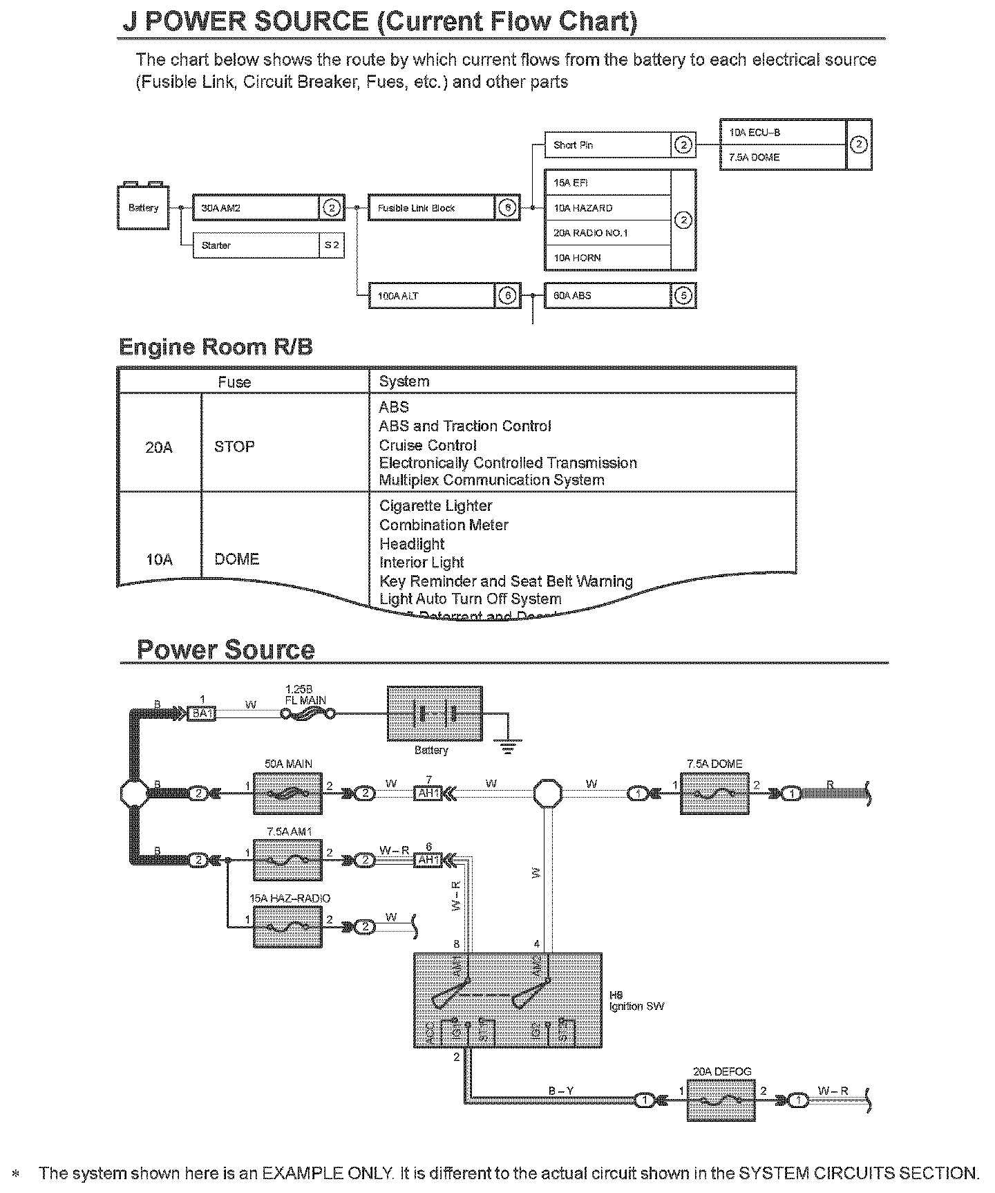 HOW TO READ POWER SOURCEThe "Current Flow Chart" section, describes which parts each power source (fuses, fusible links, and circuit breakers) transmits current to. In the Power Source circuit diagram, the conditions when battery power is supplied to each system are explained. Since all System Circuit diagrams start from the power source, the power source system must be fully understood.