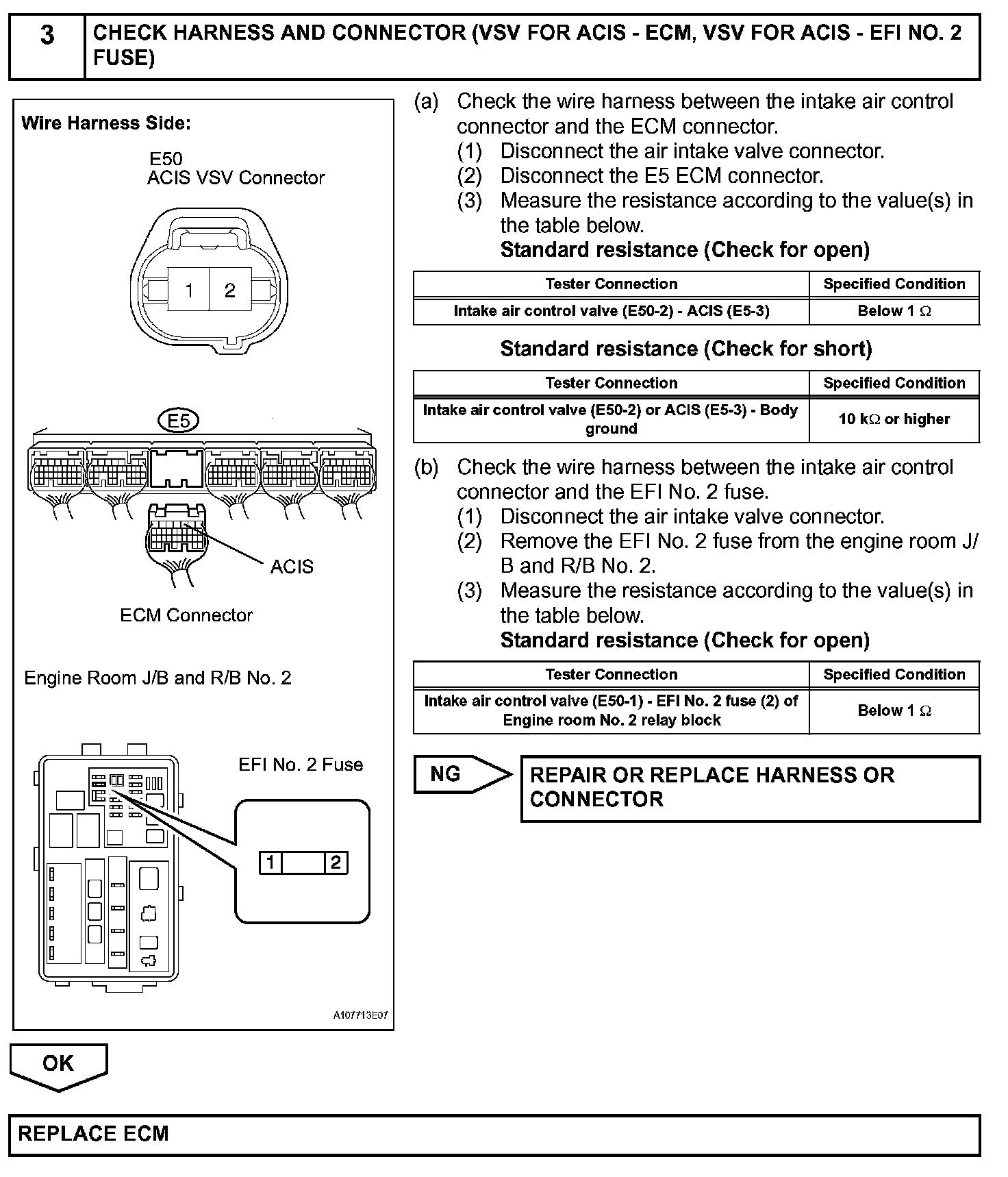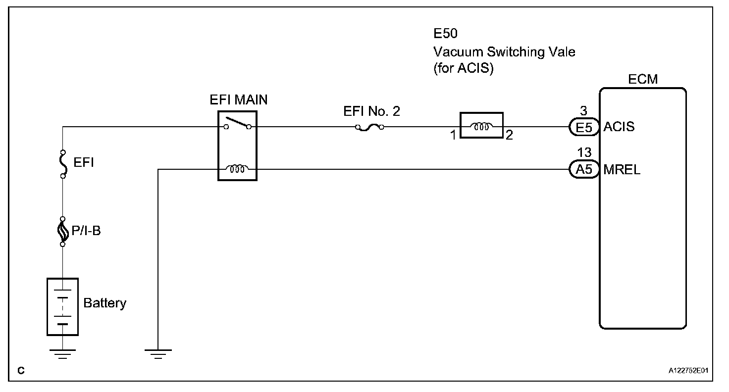 When the Intake Air Control Valve (IACV) opens and closes, the ACIS control circuit causes the engine load intake efficiency to increase. When the engine is running at 2,450 to 4,100 rpm and the throttle valve opening angle is 30 degrees or more, current flows through the ACIS control circuit and the IACV closes. For all other situations, current does not flow through the ECM and the IACV is open.