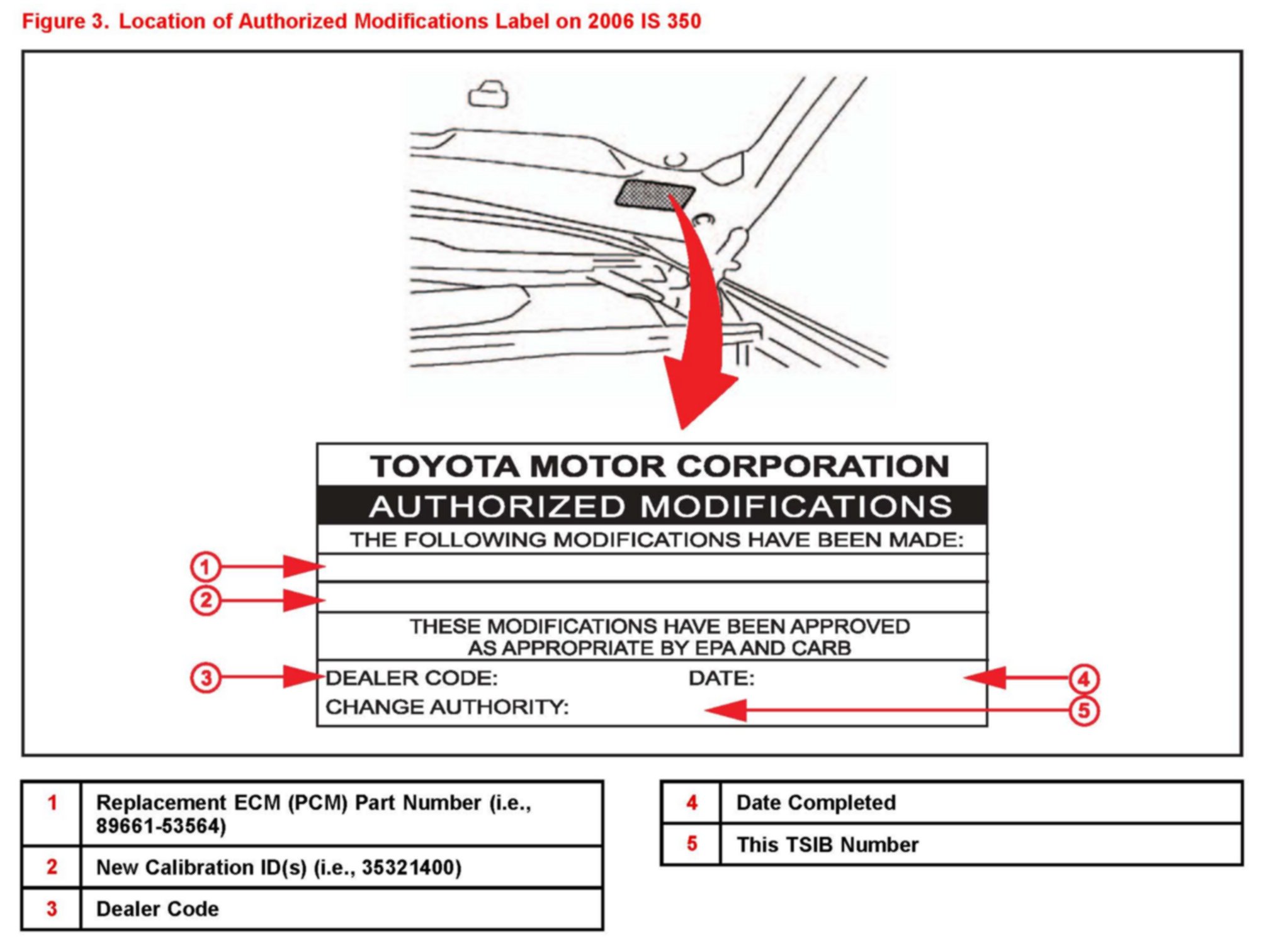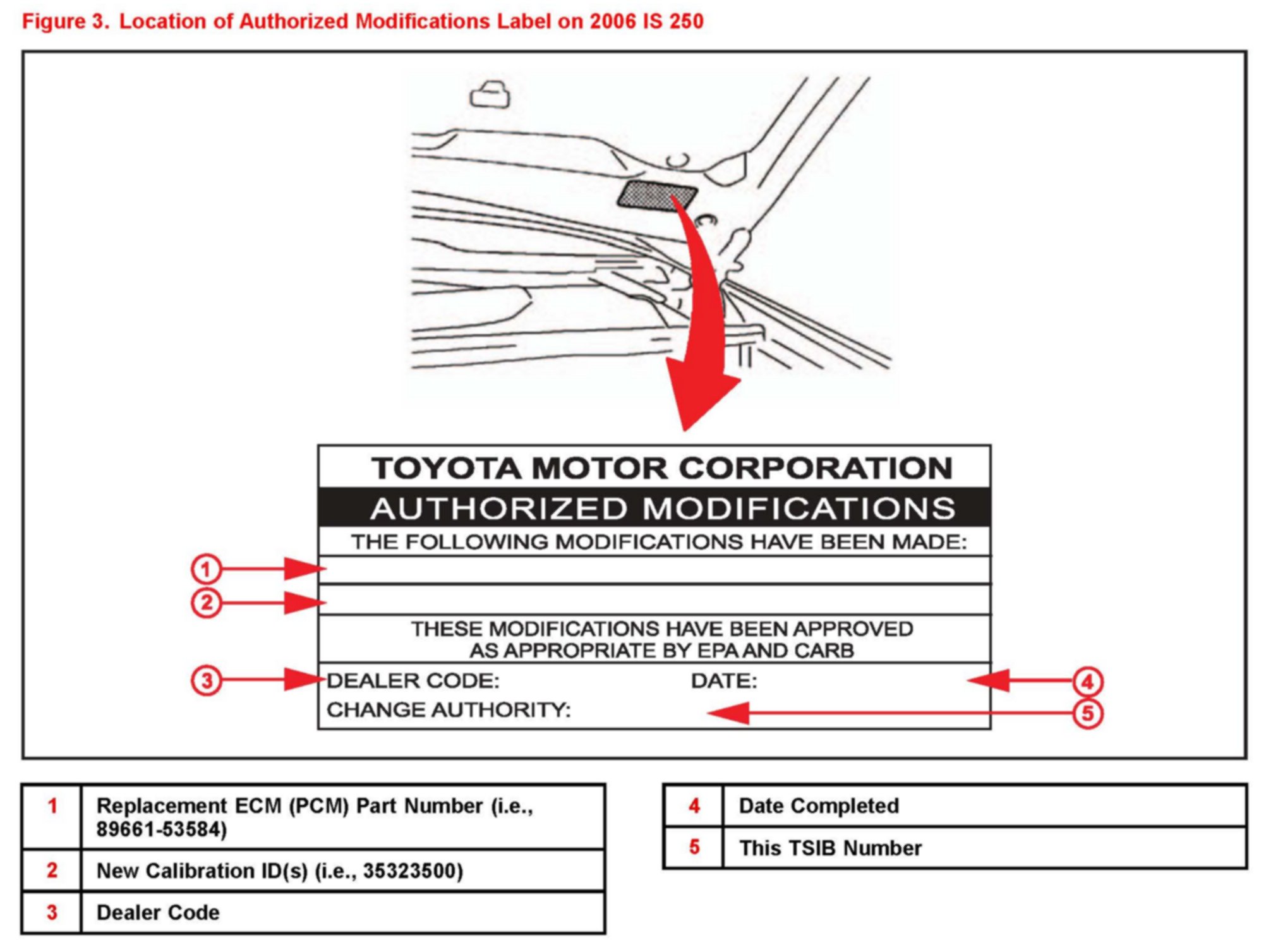 6. Check for the Authorized Modifications Label affixed to the vehicle in the location shown in Figure 3. Confirm if the ECM (PCM) calibration has been updated. If the calibration ID listed is NOT the latest ECM (PCM) calibration - go to step 7.