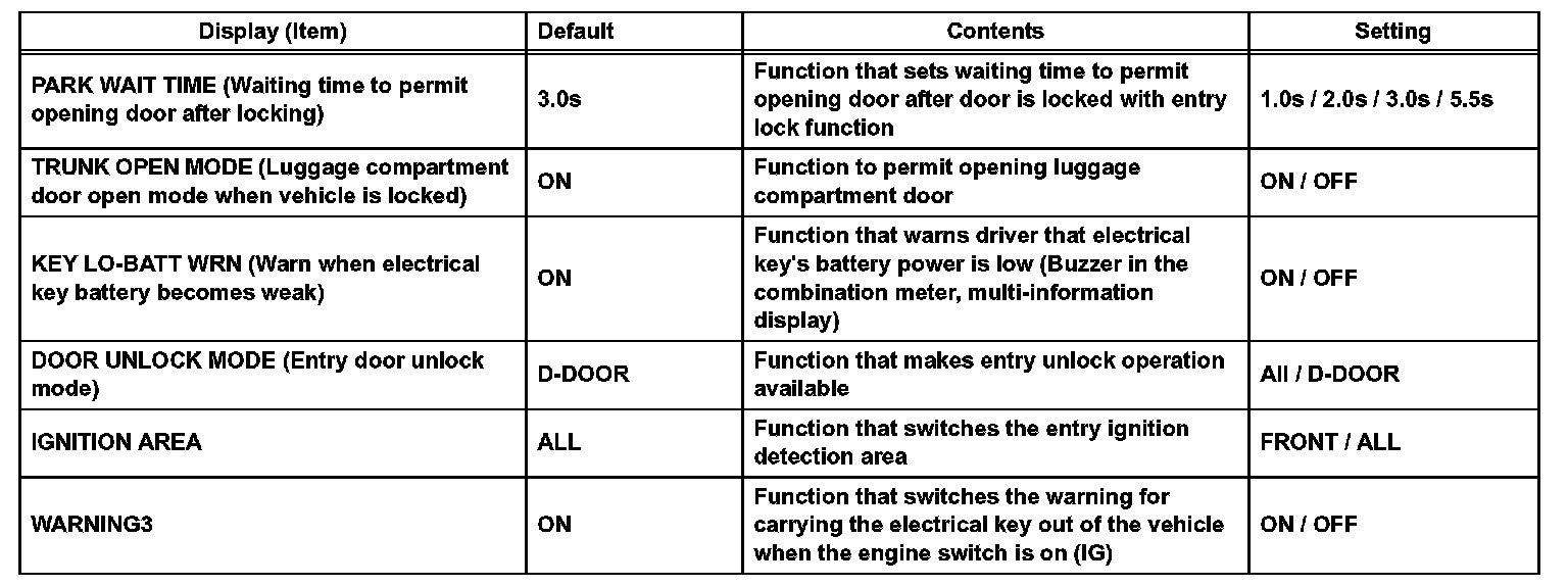 a. To change the vehicle to entry unlock mode switching function, make sure the vehicle power is off and simultaneously press and hold the electrical key's LOCK switch and another electrical key switch for 5 seconds.