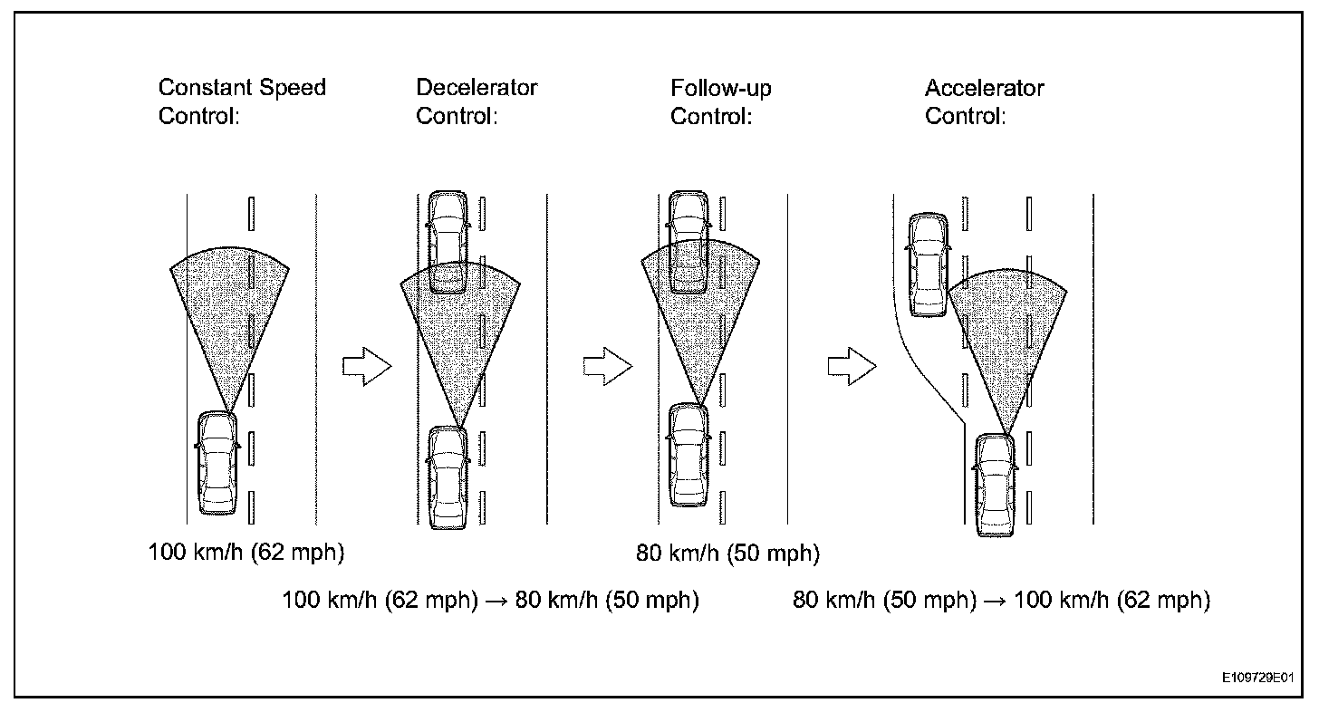 b. This system maintains the vehicle running at the speed that the driver has set, as long as there are no vehicles ahead in the same lane. Then, the system maintains the vehicle distance that has been set by the driver. If the system detects a vehicle driving at a slower speed ahead while the driver is driving at a constant speed, it closes the throttle valve to decelerate. If further deceleration is required, the system controls the brake actuator in order to apply the brakes. Thereafter, if there are no vehicles ahead within the set vehicle-to-vehicle distance because either the vehicle ahead or the driver has changed lanes, the system accelerates slowly to reach the set vehicle speed and resumes driving at the constant speed.