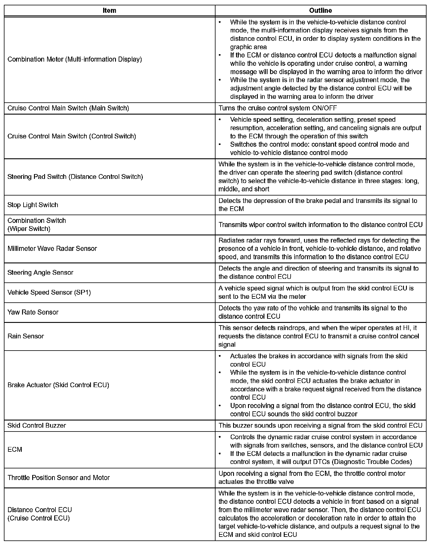 d. The millimeter wave radar sensor and the distance control ECU (cruise control ECU) control the system while the vehicle-to-vehicle distance control mode is in operation, and send signals to each actuator and ECU.