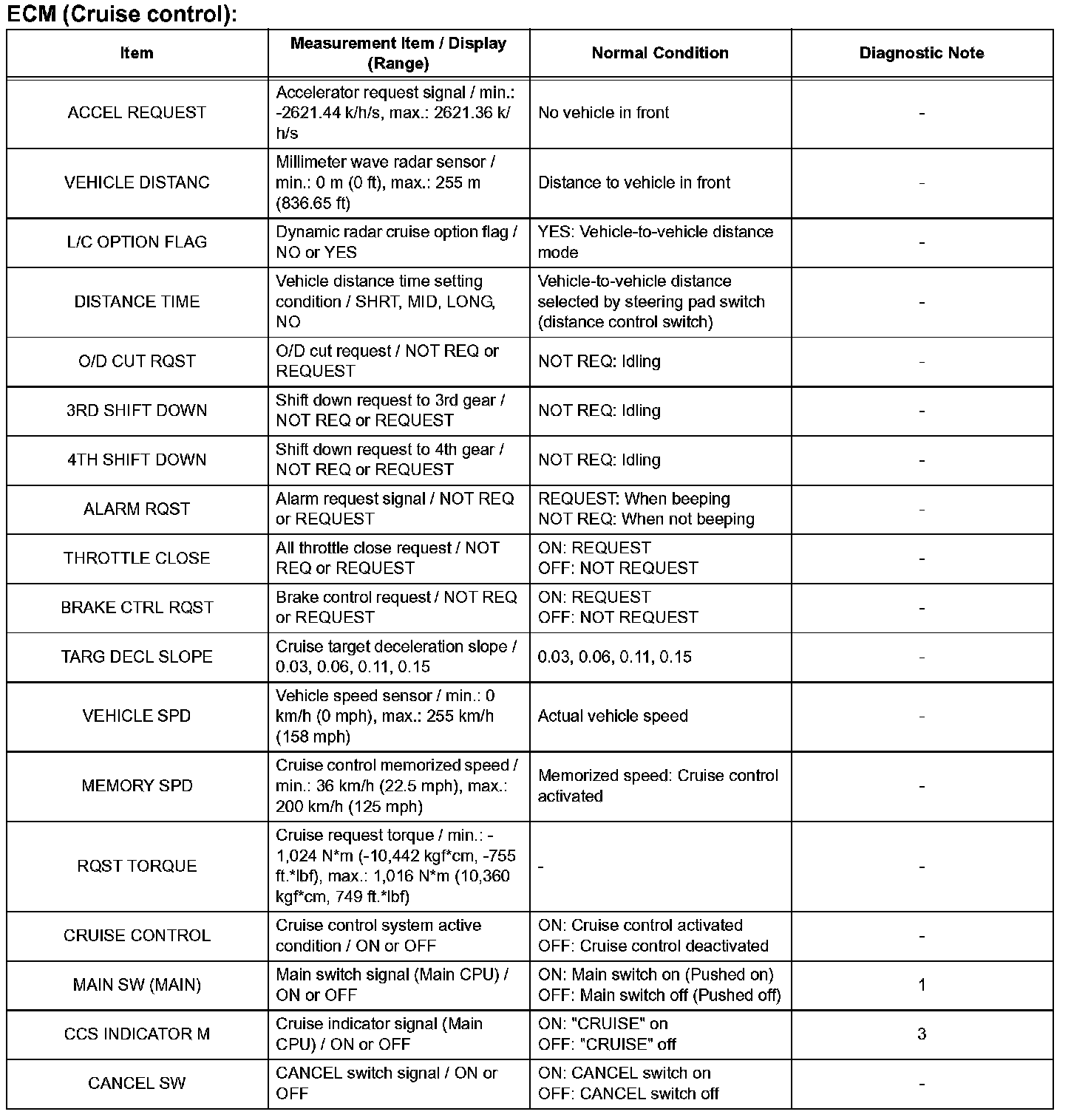 - 1 is OK, but CRUISE main indicator light does not illuminate -> Cruise main indicator light, wire harness, or ECM failure