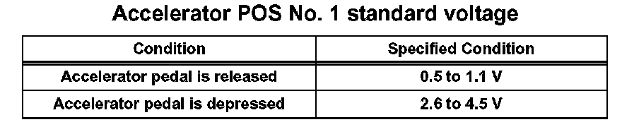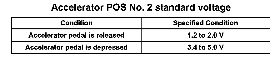 e. When depressing or releasing the accelerator pedal, check that the values of the accelerator POS No. 1 and accelerator POS No. 2 are within the specification.