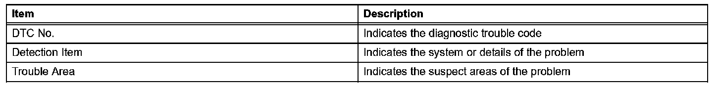Look for output Diagnostic Trouble Codes (DTCs) (from the DTC checks) in the appropriate section's Diagnostic Trouble Code Chart. Use the chart to determine the trouble area and the proper inspection procedure. A description of each of the chart's columns is as shown in the table.