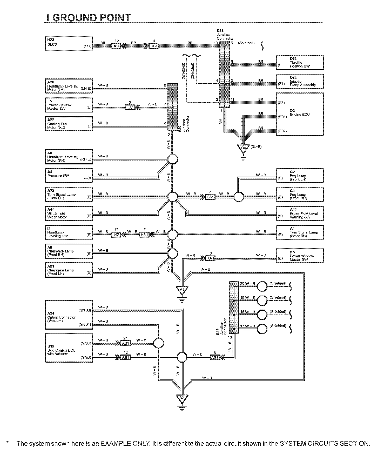 HOW TO READ GROUND POINTSThe ground points circuit diagram shows the connections from all major parts to the respective ground points. When troubleshooting a faulty ground point, checking the system circuits which use a common ground may help you identify the problem ground quickly. The relationship between ground points ( [A1] , [A2] and [D4] shown as given) can also be checked this way.