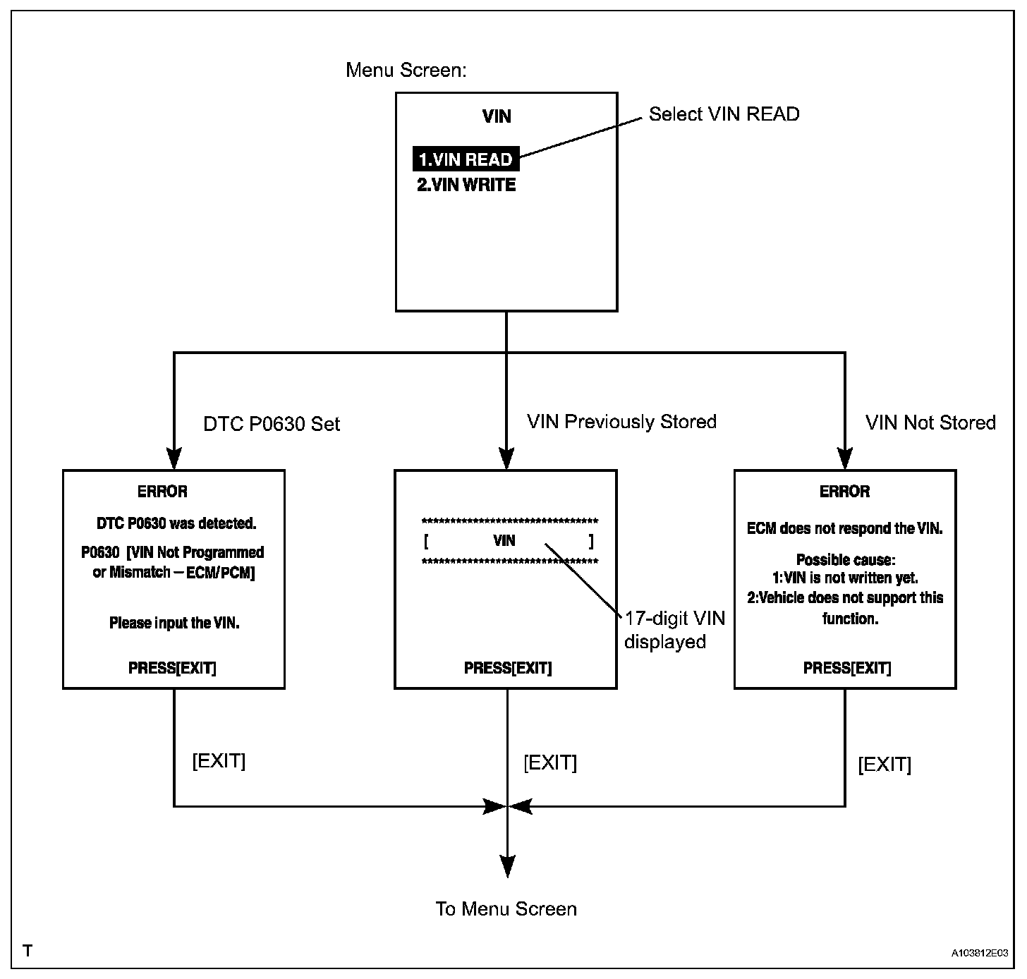 a. The flowchart of the VIN reading process is shown. This process allows the VIN stored in the ECM to be read, in order to confirm that the two VINs, provided with the vehicle and stored in the vehicle's ECM, are the same.