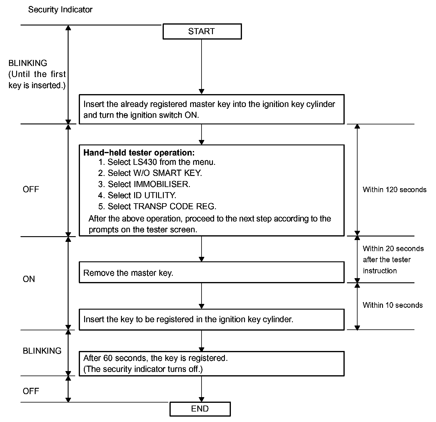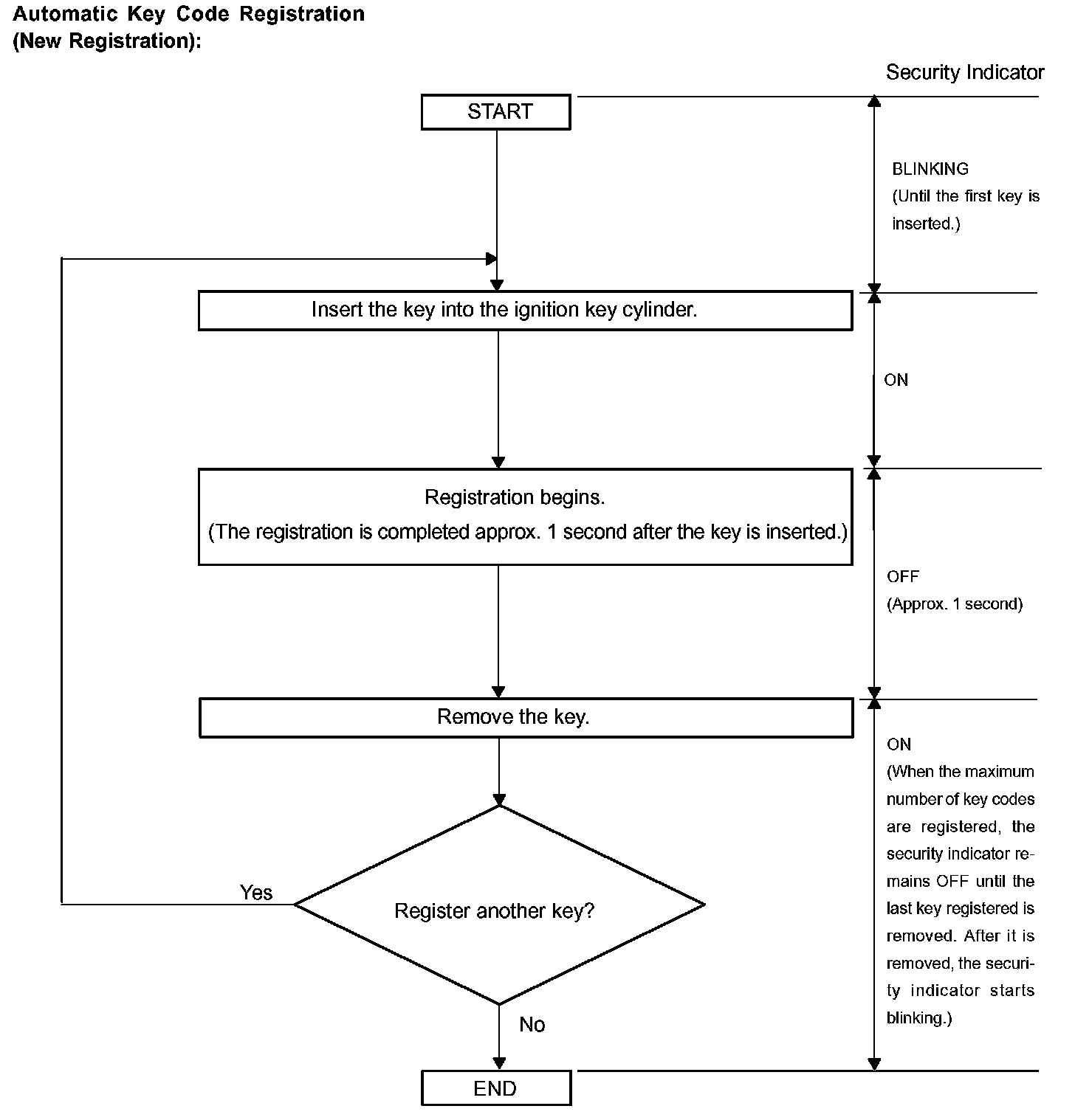 - When no key is inserted into the ignition key cylinder in automatic key code registration mode, the security indicator remains on.