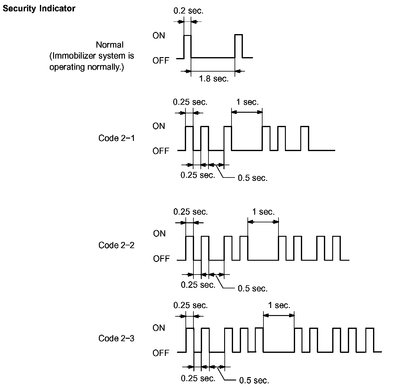 - When the immobilizer system is operating normally and the key is pulled out, the security indicator blinks continuously.