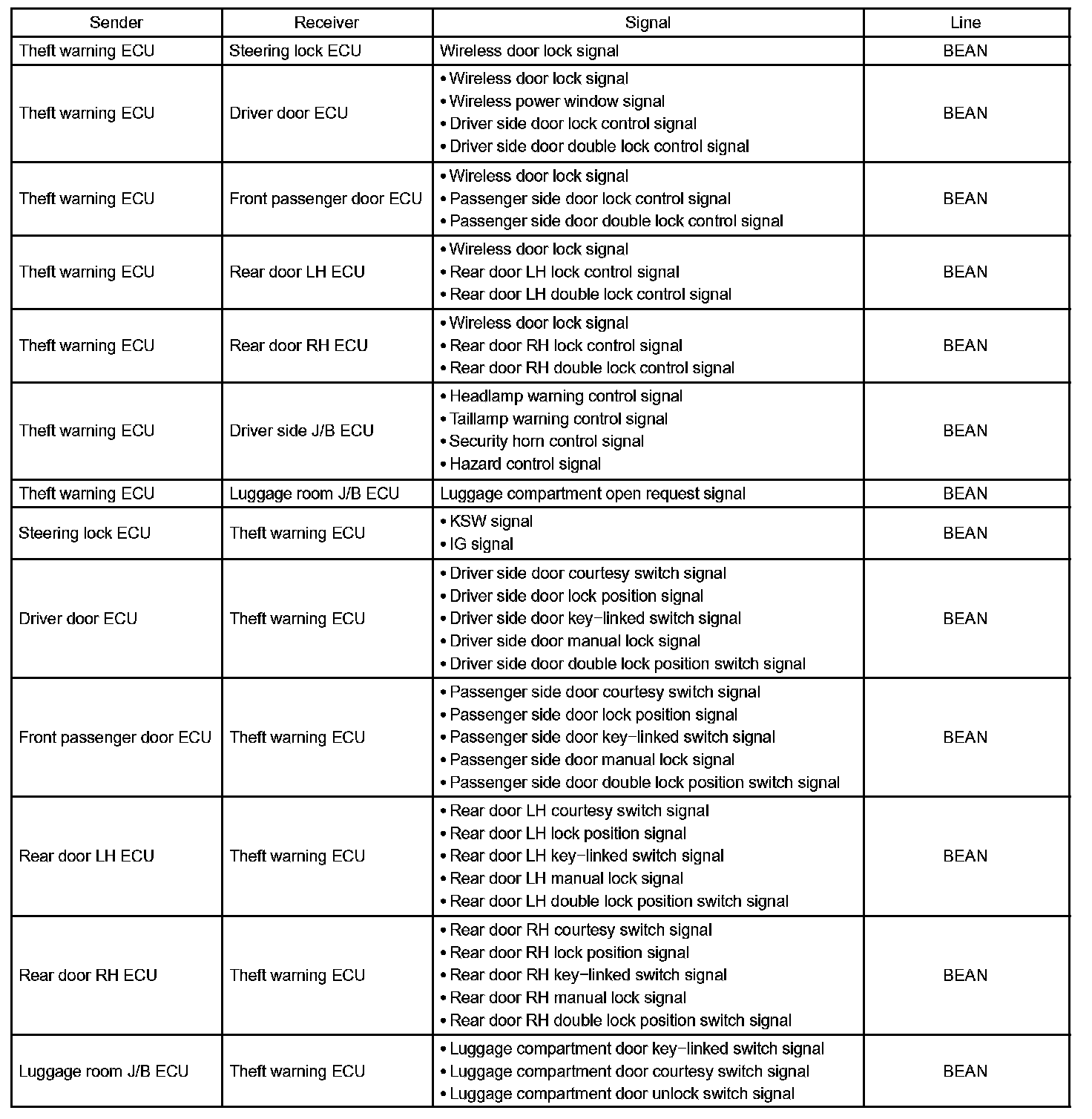 The theft warning ECU receives door control transmitter door LOCK/UNLOCK switch signals through the serial communication line. It sends door LOCK/UNLOCK control signals to each seat's door ECU through the multiplex communication line.